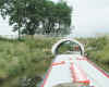 Upstream view of the railway bridge clearly showing the curved invert. Savick Brook / Ribble Link.