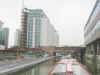 A "Business Barge" and The Westway Bridge. Paddington Basin.