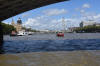 Limehouse Basin. The three departing craft jockey for position in the lock