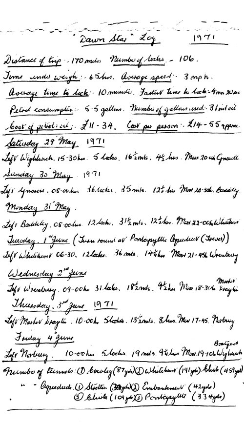 The Maurice Arlidge log just about says it all. We started from Mermaid Hire Cruisers at Wightwick, just below Wolverhampton on the Staffs and Worcs. Shropshire Union and Llangollen Canals and back in a week. Of course, not a lot of traffic then! Boat was fibreglass 40 ftish Dawncraft - Dawn Star. It is amazing to think how many people were packed in this little boat, (by today's standards.)