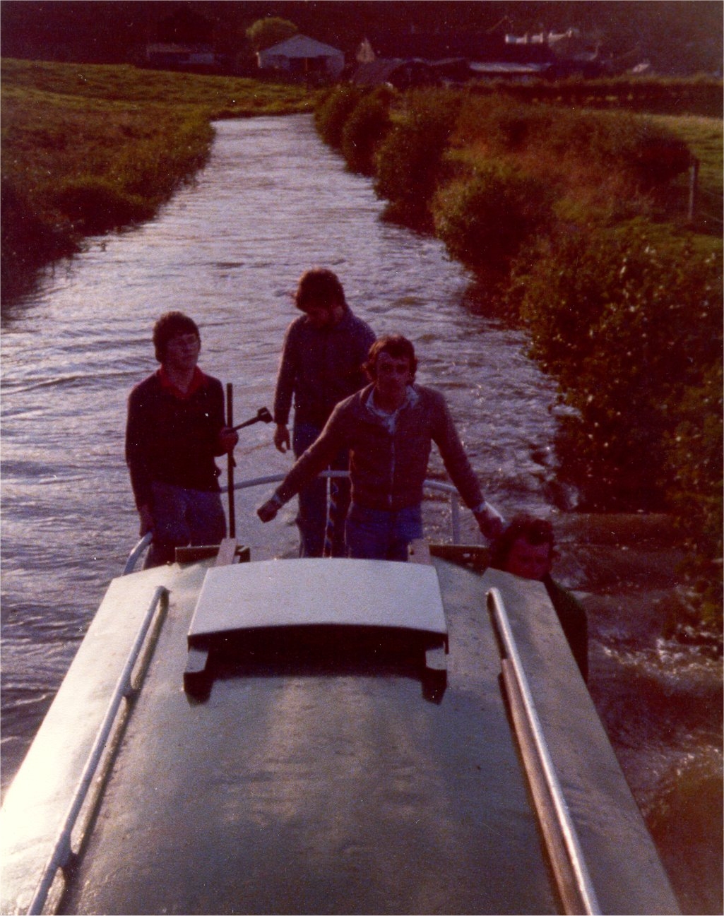 ![]() John F - windlass at the ready, Neil walking round cants, Dave Creasy steering and Julian E. Please ignore the "enthusiastic approach" visible in bow wave! Caldon Canal. |