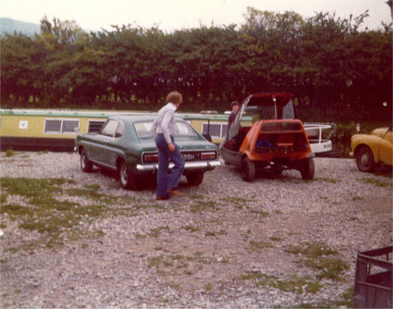 ![]() Loading up Warwick Castle at Peak Forest Cruisers base , just outside Macclesfield. Early Peak Forest boats had Fernie Hulls and Lister's. Warwick Castle was 45ft and was rather whizzy, as it had an SR3. Note Julian E's groovy Capri CLH555H (dig the rostyle wheels!), John Fleming's crazy Bond Bug and the hire base Morris 1000 van done up in boatyard colours! Macclesfield Canal. |