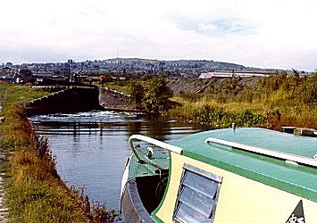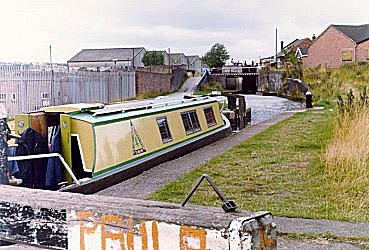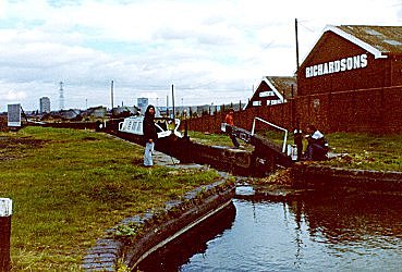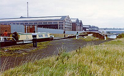 ![]() Going down Factory Locks, Tipton. New Main Line. BCN. (Slide by John Rushbrook.) |