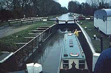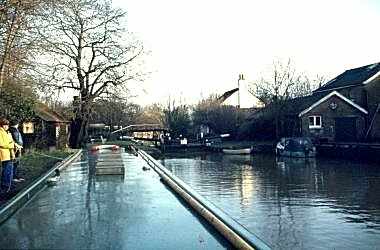 This was our first and only attempt at a short term winter hire break. The crew was Neil, Linda and John Rushbrook. The boat "Guildford Knight" was hired from Guilford Boat house just after Christmas 1982. The Wey was virtually in flood and the Thames had red boards up, so we could not go out. Poor old John fell in approaching a lock and got frozen! One of the Wey locks had been damaged and we were held up for half a day while the Wey crew refitted the gate. Much time spent at the Anchor pub at Pryford. The gas ran out one night and the spare bottle was empty! We ended up bringing the boat back early and got a partial refund! This was the start at a few aborted attempts of winter boating!