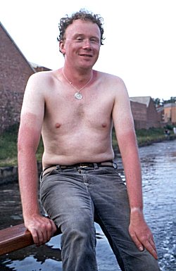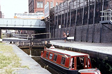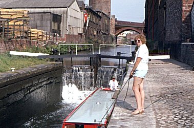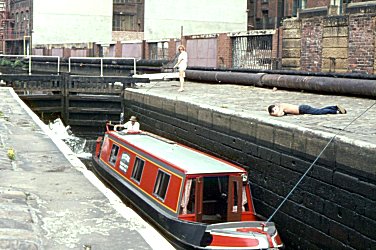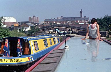 Tuesday June 19th - Left at 7.00, already warm and sun out. Arrived at Rochdale Nine Locks at 14.15 and spent leisurely one and a half hours going down to Castlefields. Carried on the Bridgewater, as Castlefields was not very salubrious then! After a hack along the start of the Bridgewater, we were waved down by fishermen. At first we thought that they were moaning about our speed, but it was more serious than that. Apparently a kid had fallen in the canal and was missing. His mate quickly got help and Fire Brigade frogmen were all ready in the canal. We got off with our barge pole and poled along the weedy banks. Eventually after about half an hour the firemen found the kid. He was dead, the firemen, fishermen and us packed up despondently. The firemen were particularly upset, as they had missed finding the kid, only a matter of yards from where his mate said he fell in. We soon carried on with renewed gusto, as we had arranged to meet Alan Marsden, Linda's old mate from Brunel Uni. This was at a pub after Sale and Altrincham. It was believed to be what is now the Ye Old No 3. We stopped at 19.00 and Alan was already there. Bar meals and pint in the pub. Very hot all day - the reason the kids had been playing by the water.