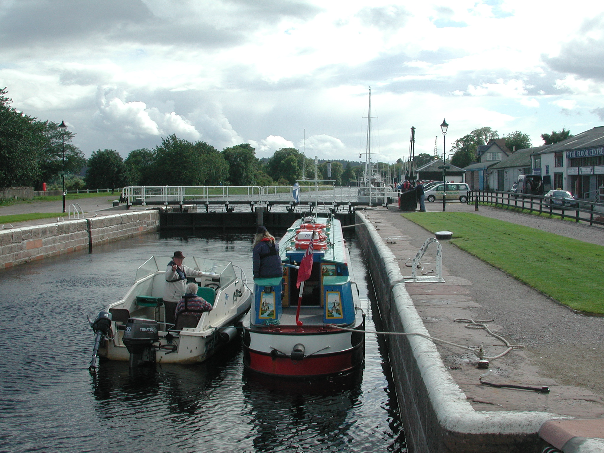 Muirtown Staircase Top Lock. We have been joined by a small Shetland Cruiser for