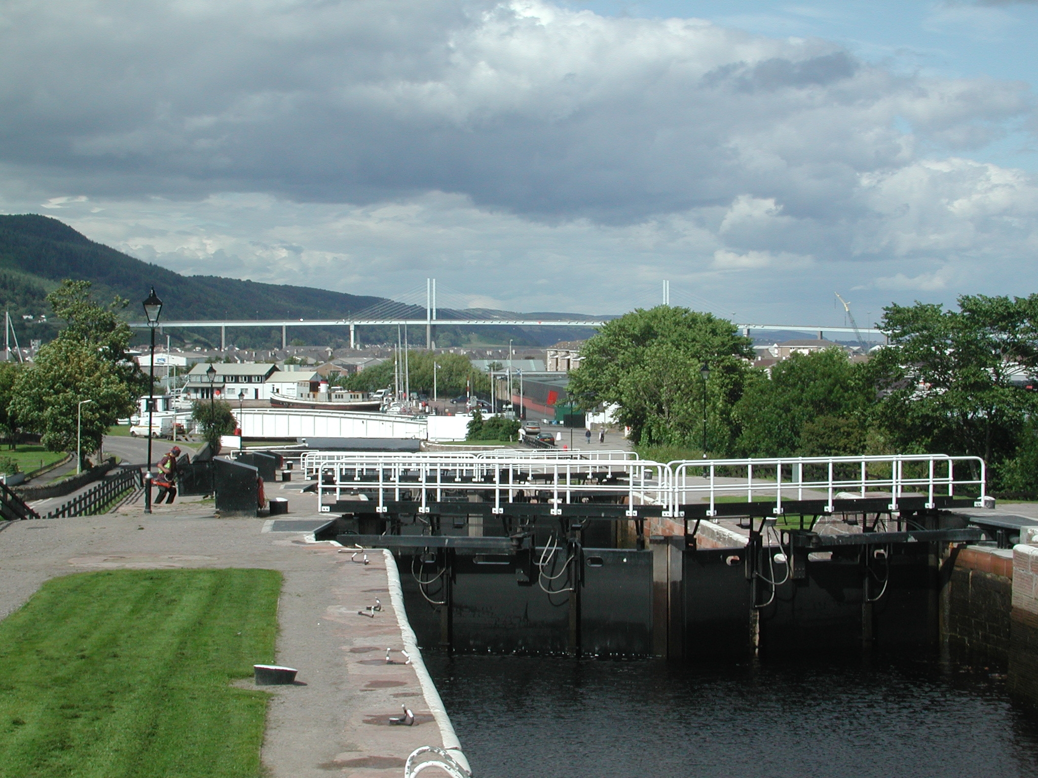 Looking down Muirtown Locks at Inverness and the Kessock Bridge. Caley Canal.