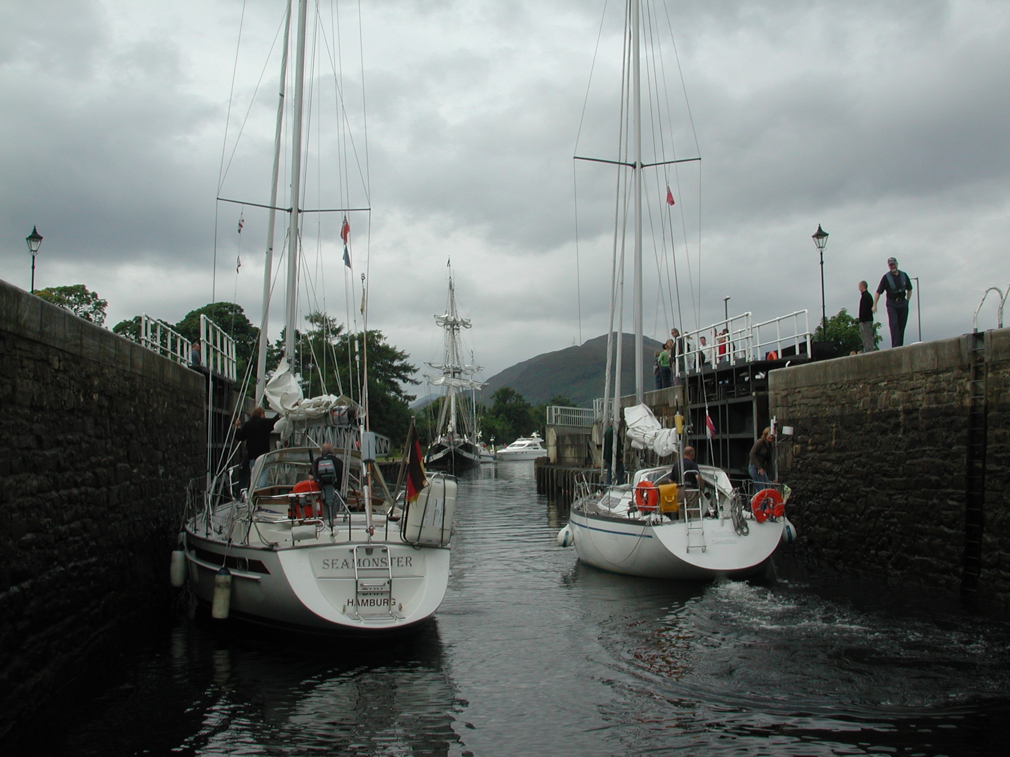 A Norwegian and German yacht join us in Clachnaharry Sea Lock. Caley Canal.