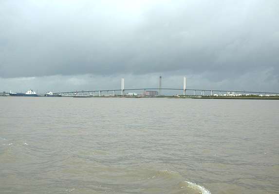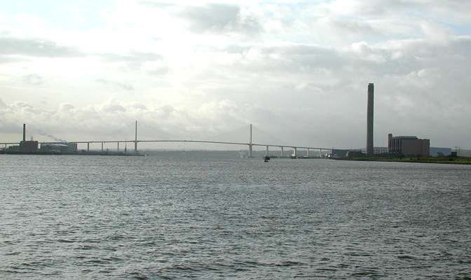 ![]() First view of QE2 Bridge. Tilbury Power Station to left and Littlebrook Power Station to right. |