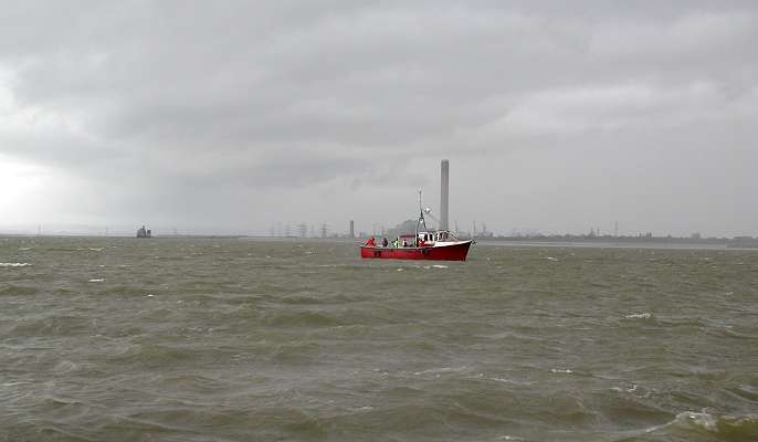 ![]() Rounding Grain Spit. Looking up Medway. Grain Tower (island) and Grain Power Station. We disturb the fishermen! |