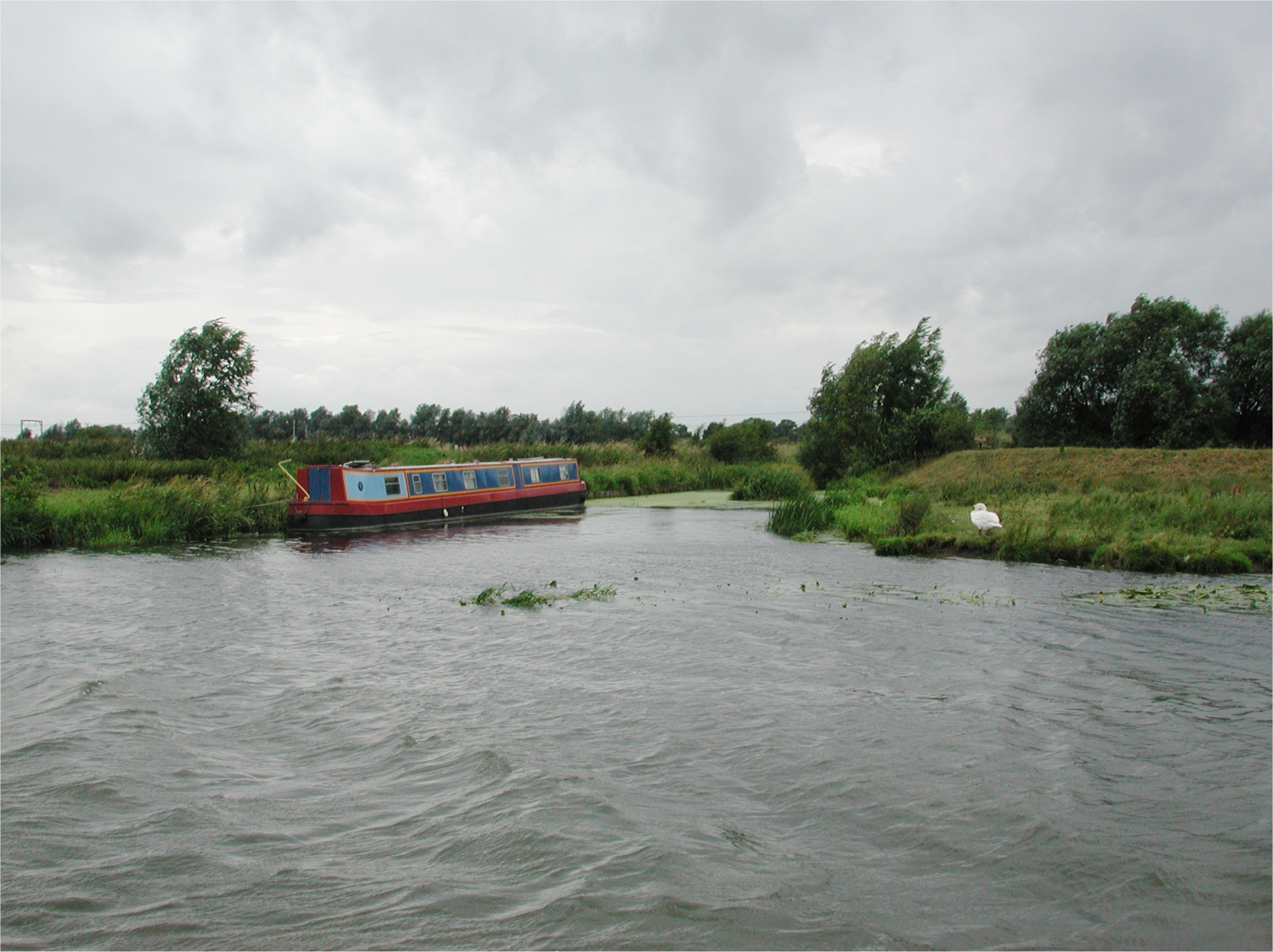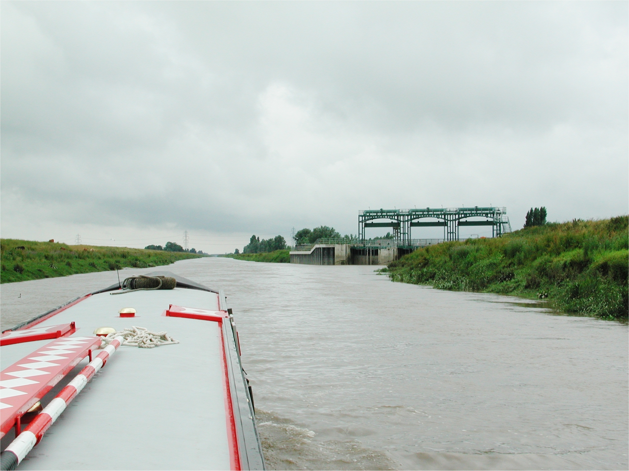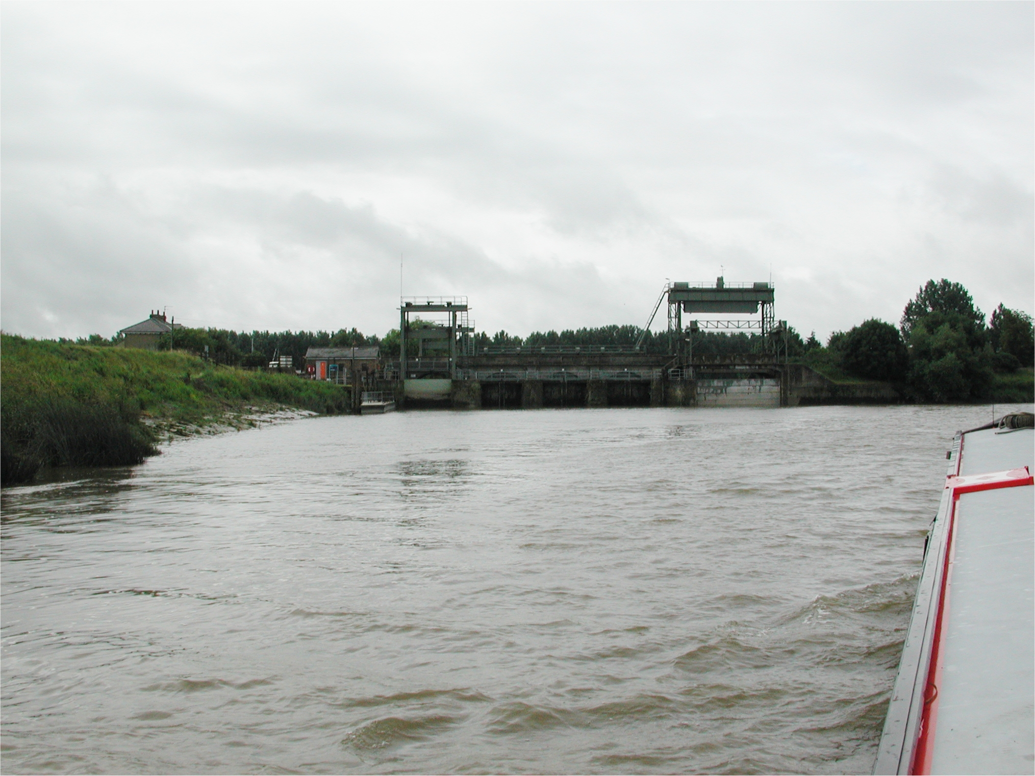 Steaming up on the flood, passed Denver Sluice. Tidal River Great Ouse.