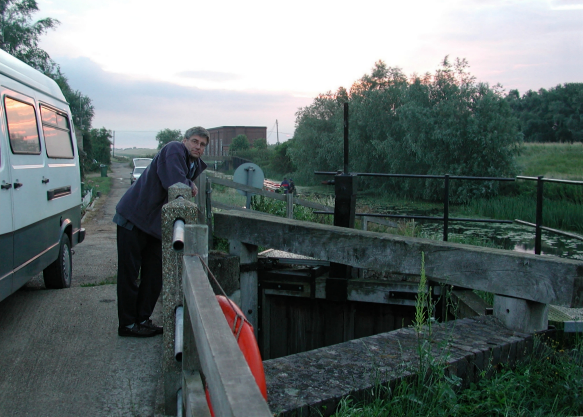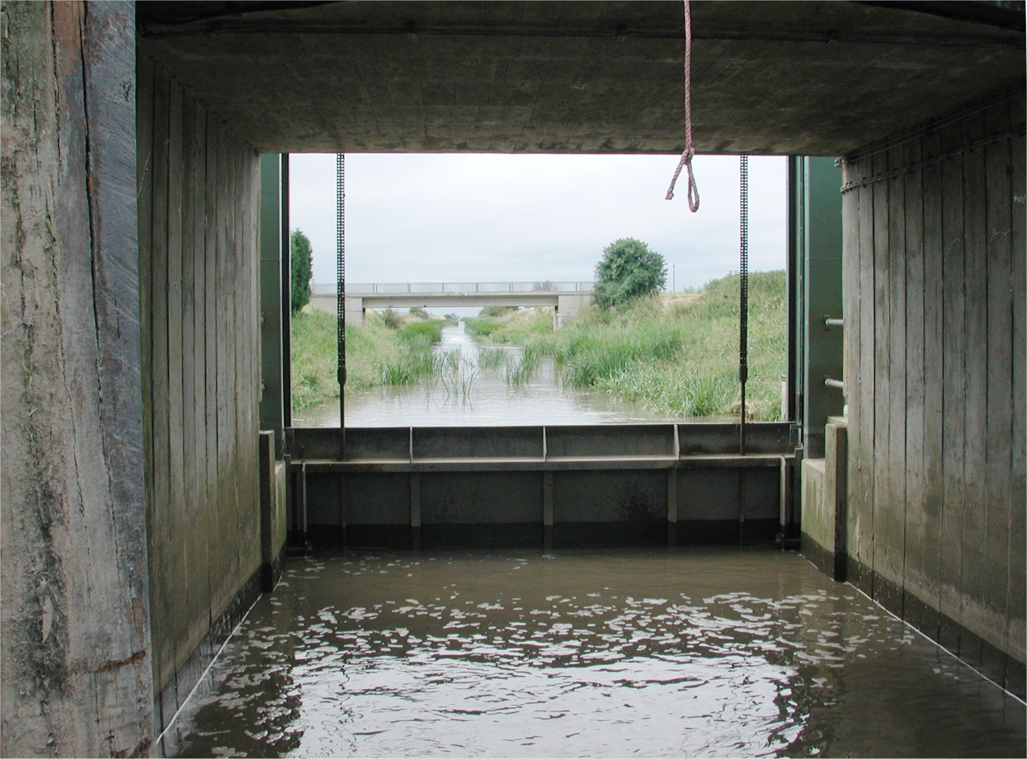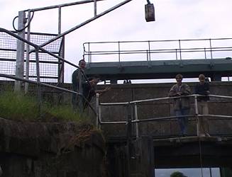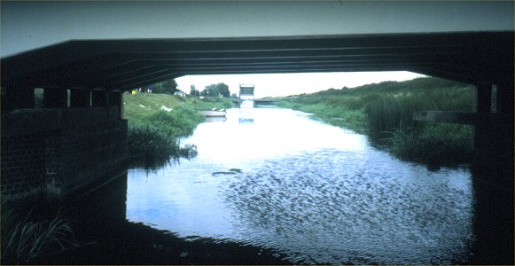 guillotine sluice gate (closed in time of flood) the downstream side of the road bridge. Neil and Doug