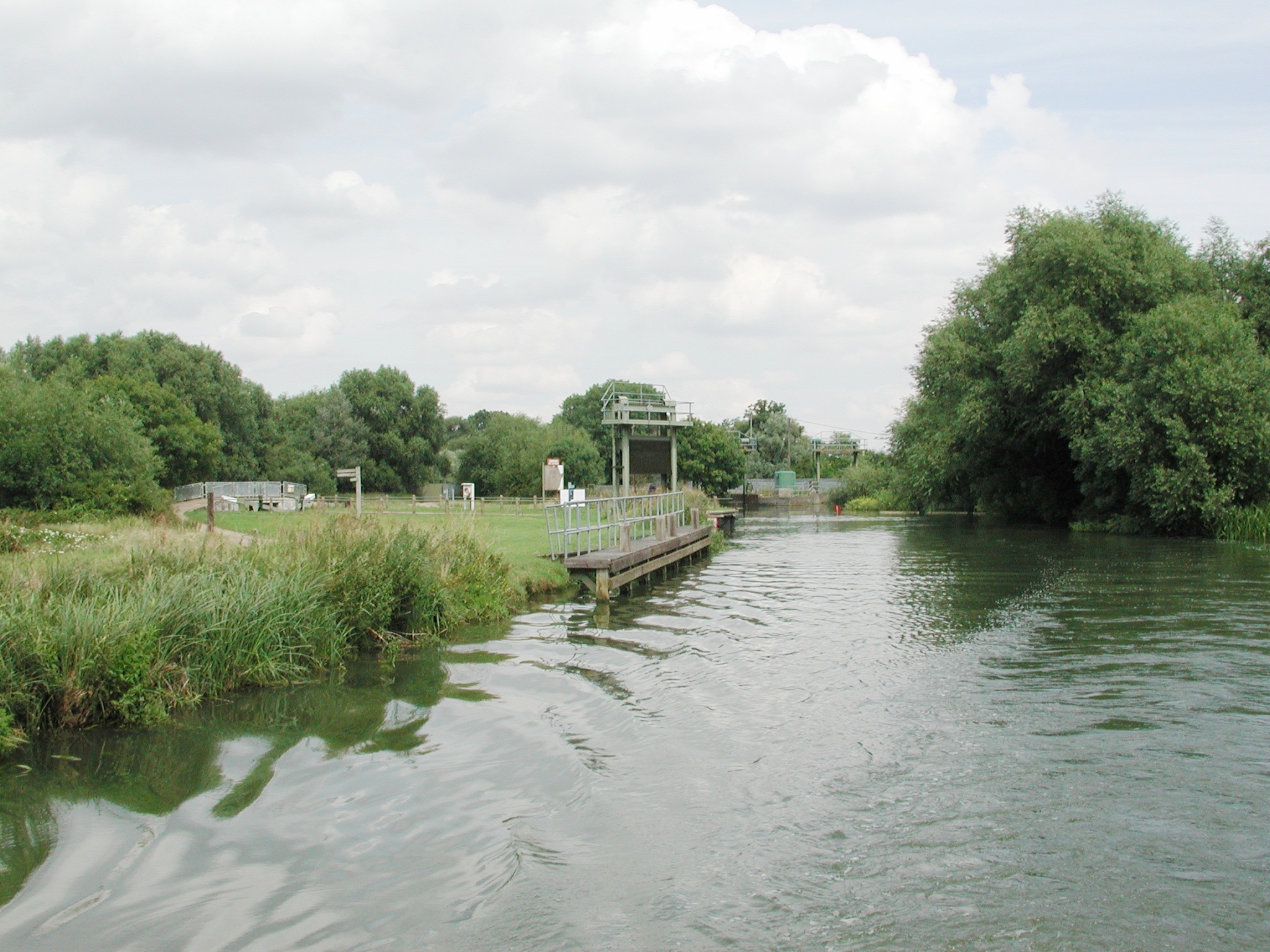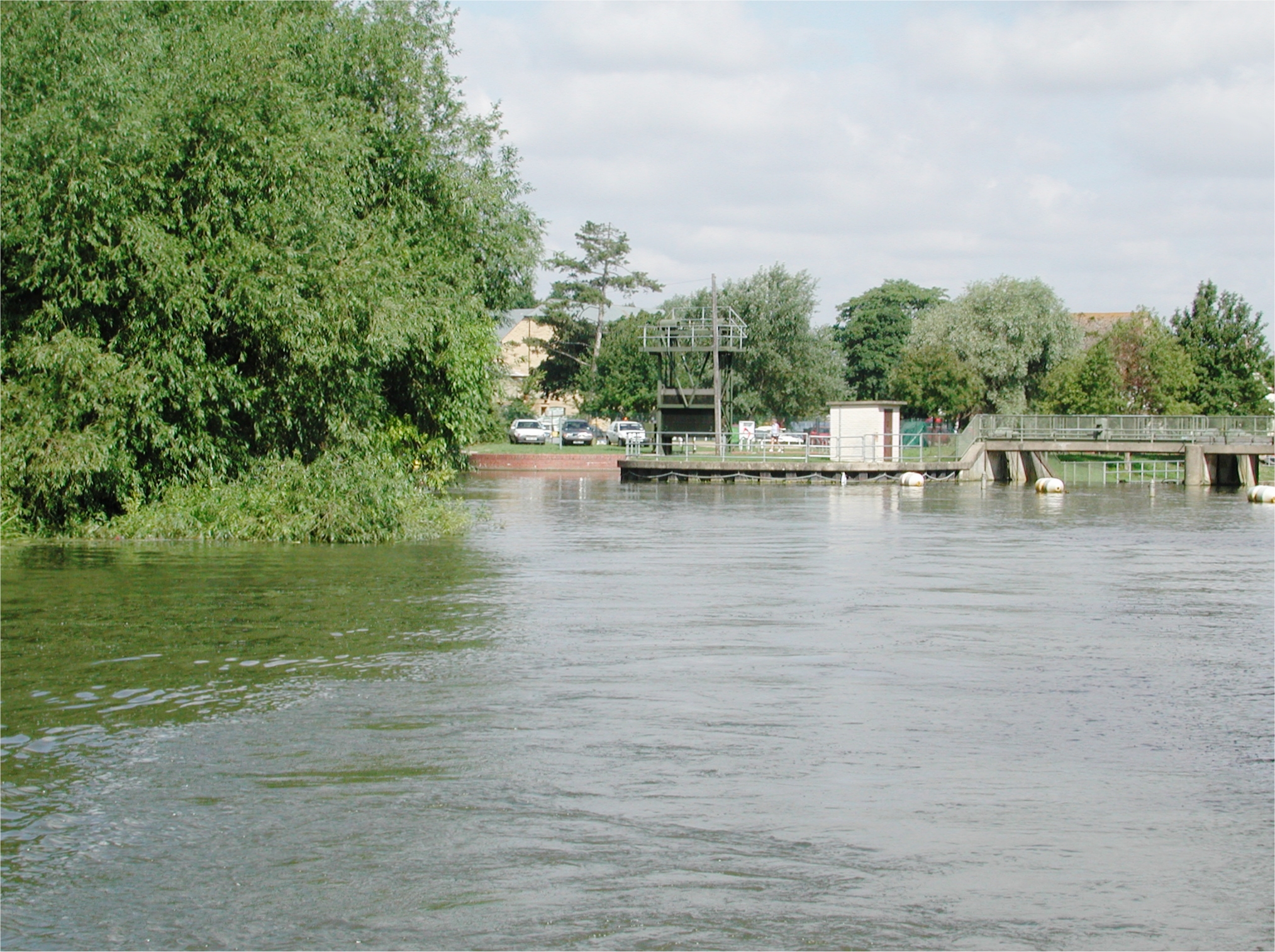Looking down the Upper River and weir to Lower River. River Great Ouse.