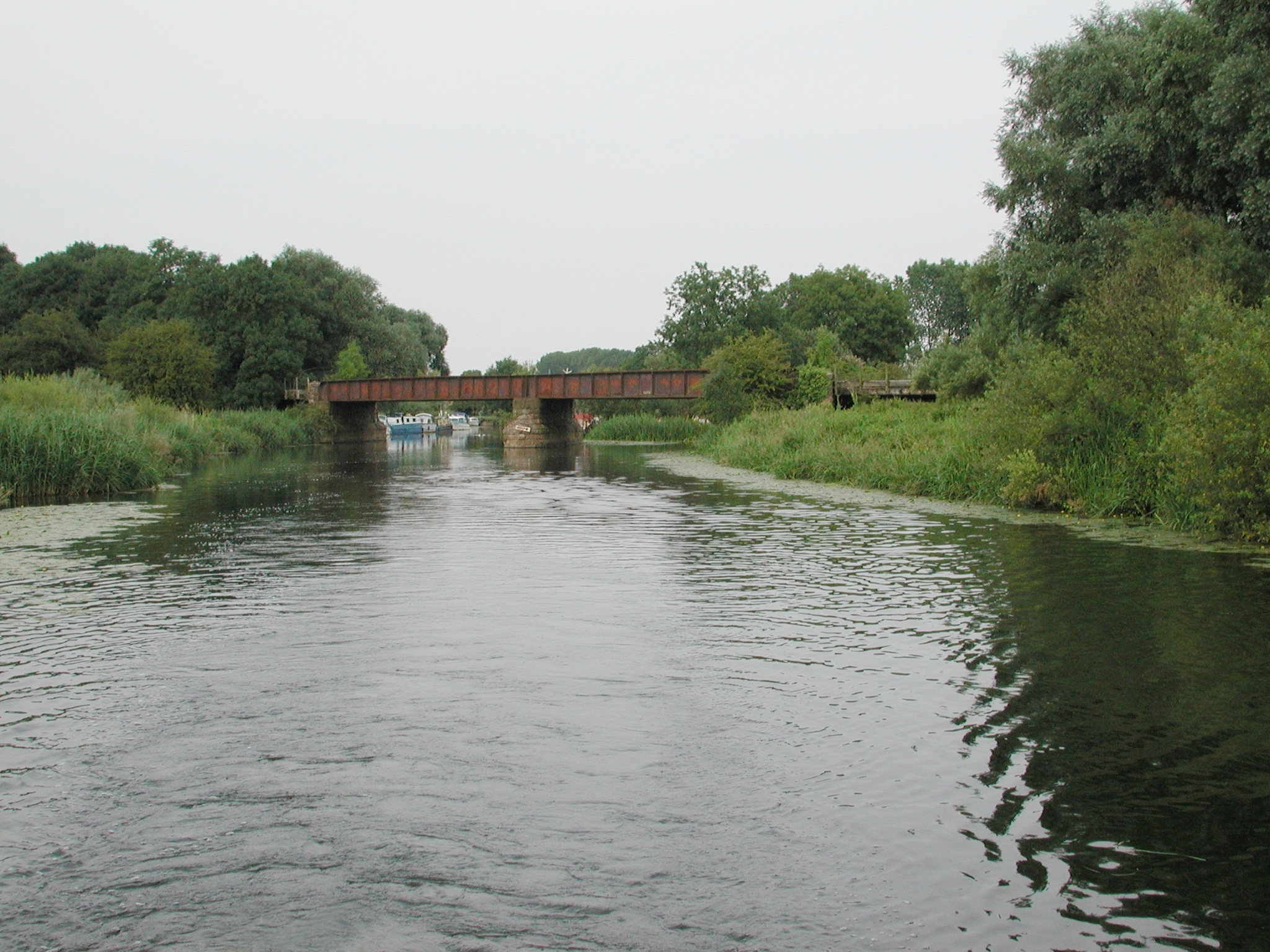 Leaving Lower Ringstead Lock and disused railbridge. River Nene.