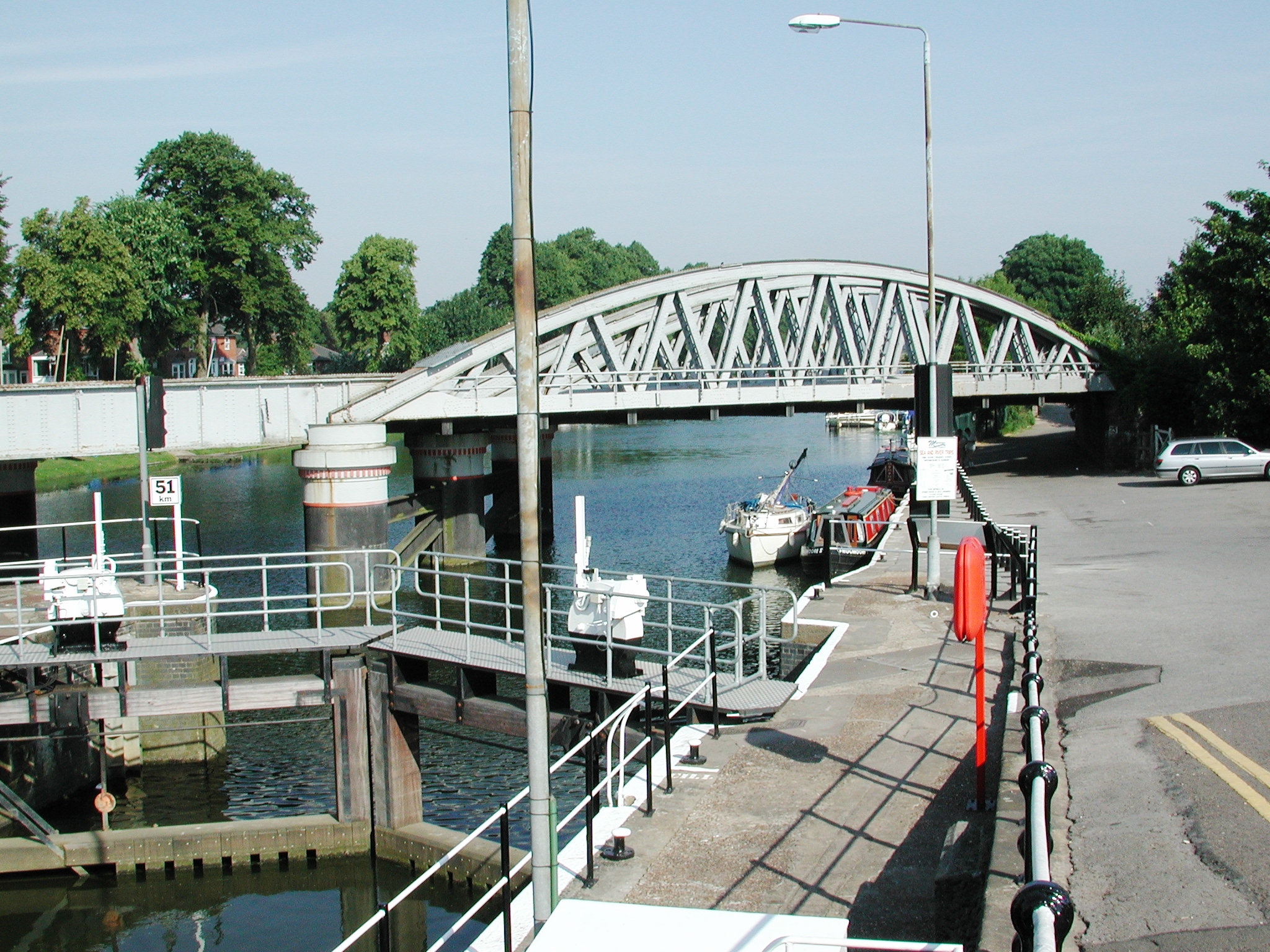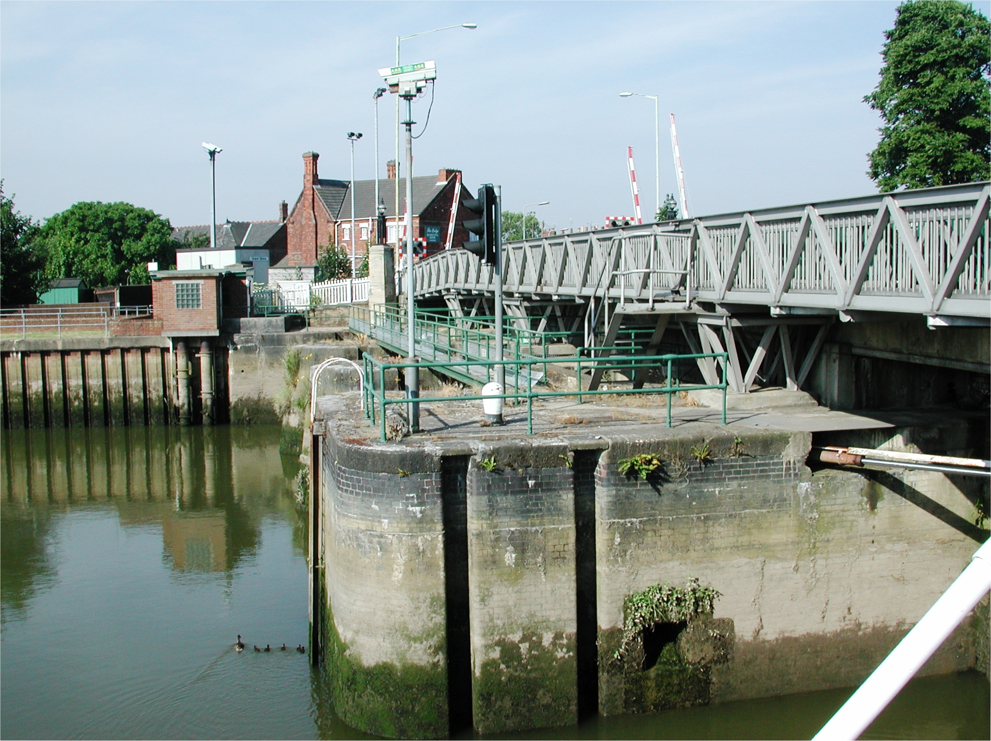 Boston. Tidal River Witham. Old swing railway bridge to Boston Docks.