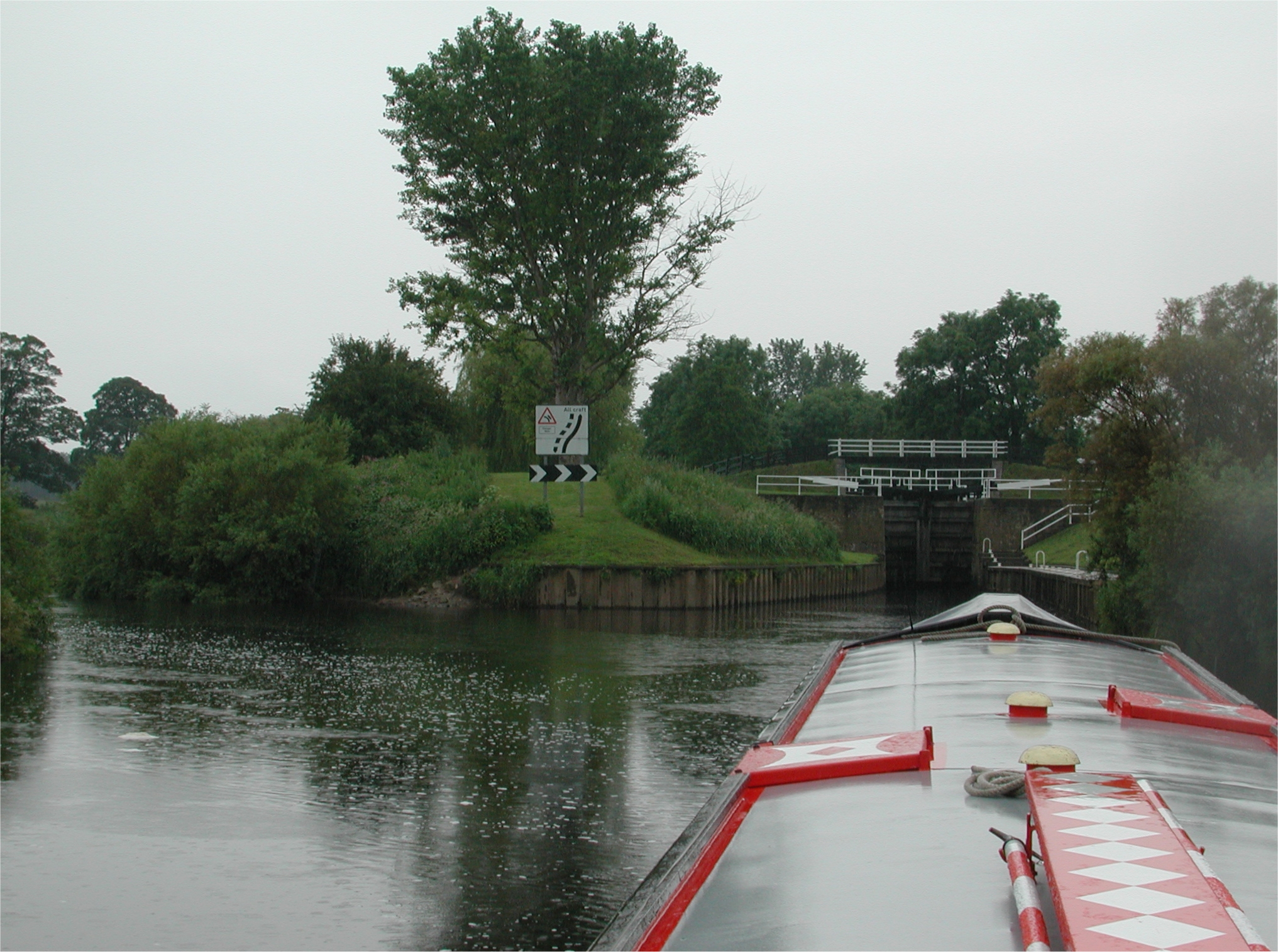 Approach to Linton Lock. Large buoyed shingle bank to left. Lock / lock island