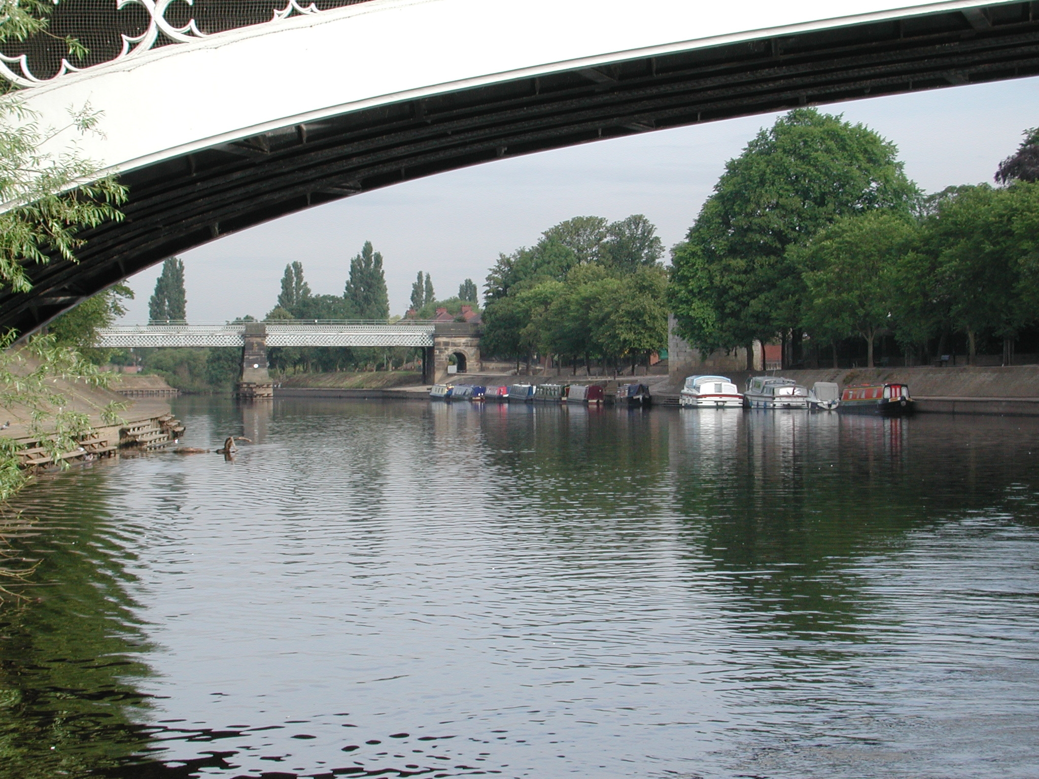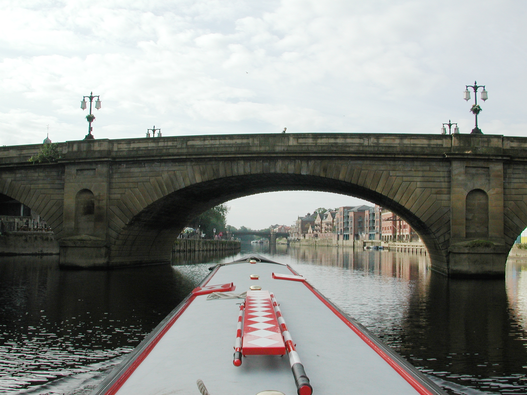 Passing under Ouse Bridge, Skeldergate Bridge in the distance. York. River Ouse.