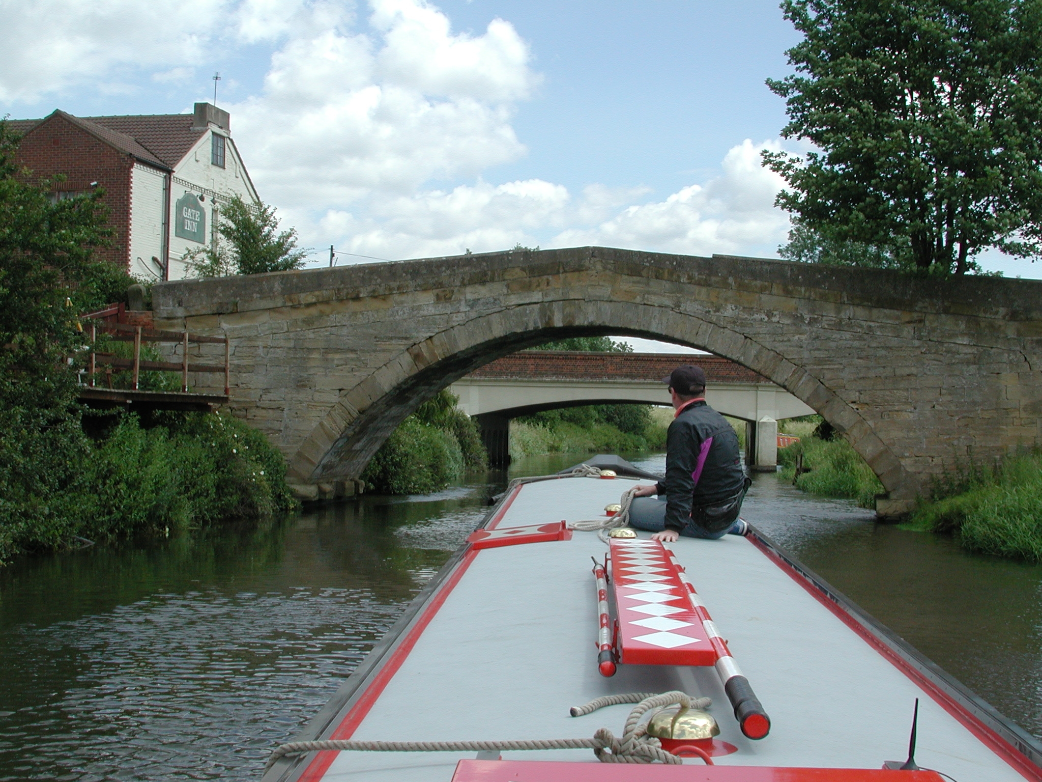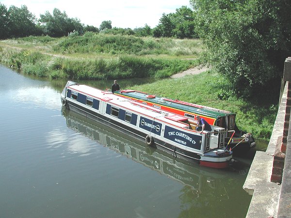 narrowboat that has been under the bridge, but could not wind. Picture Martin Wilson. River Idle.