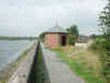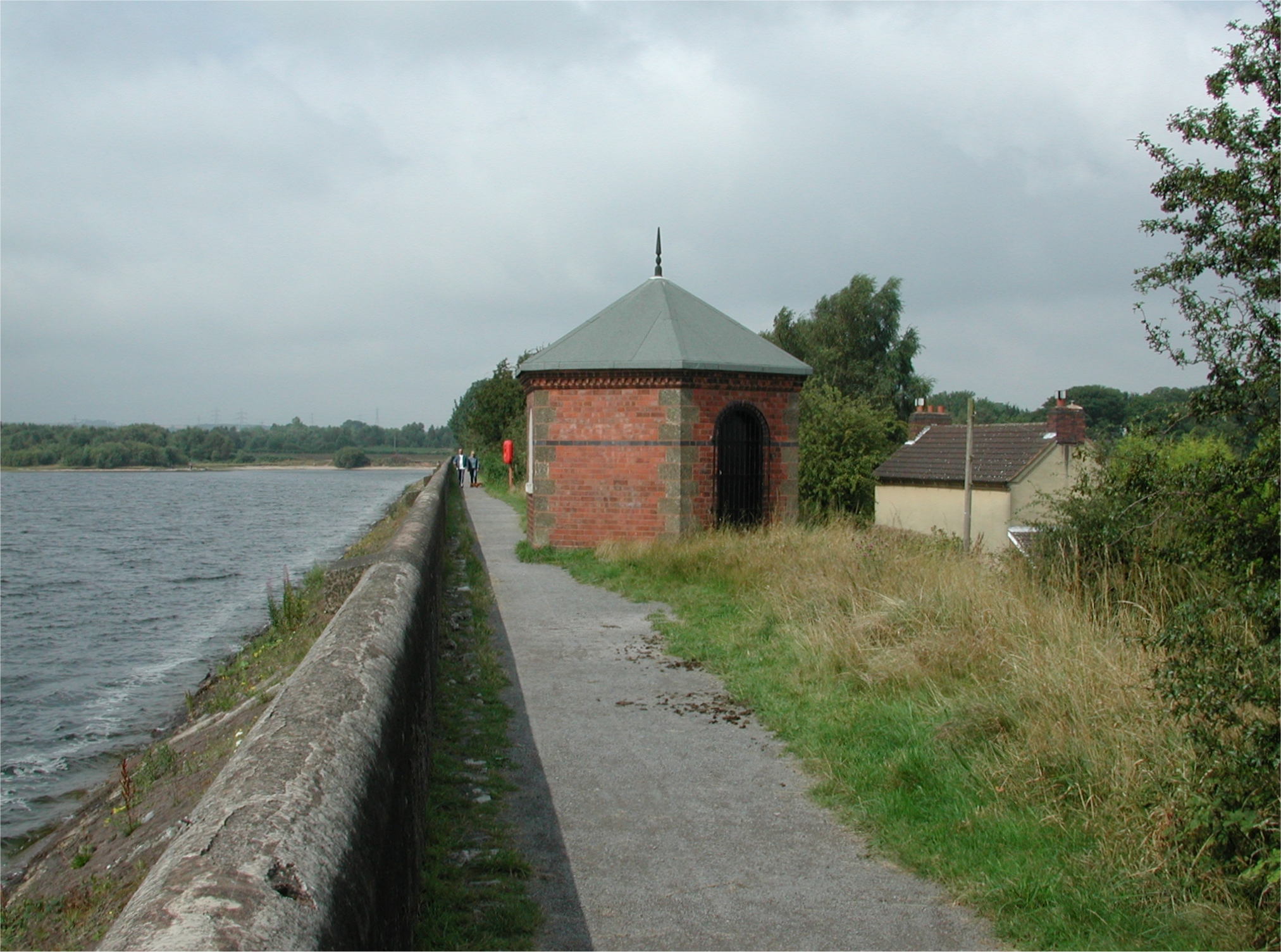 Anglesey Basin. Looking up at the valve house and dam of Chasewater. Anglesey