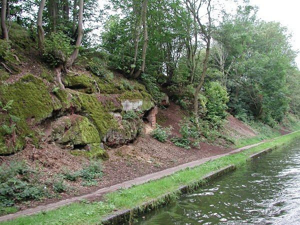 Perry Barr Cutting - rock strata supported on brick piers. Tame Valley Canal.