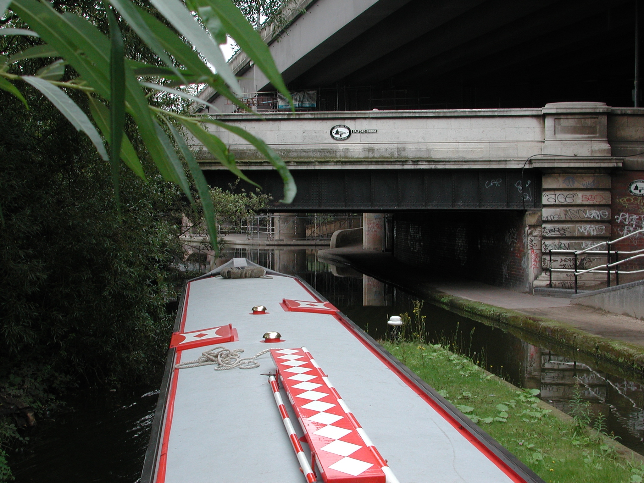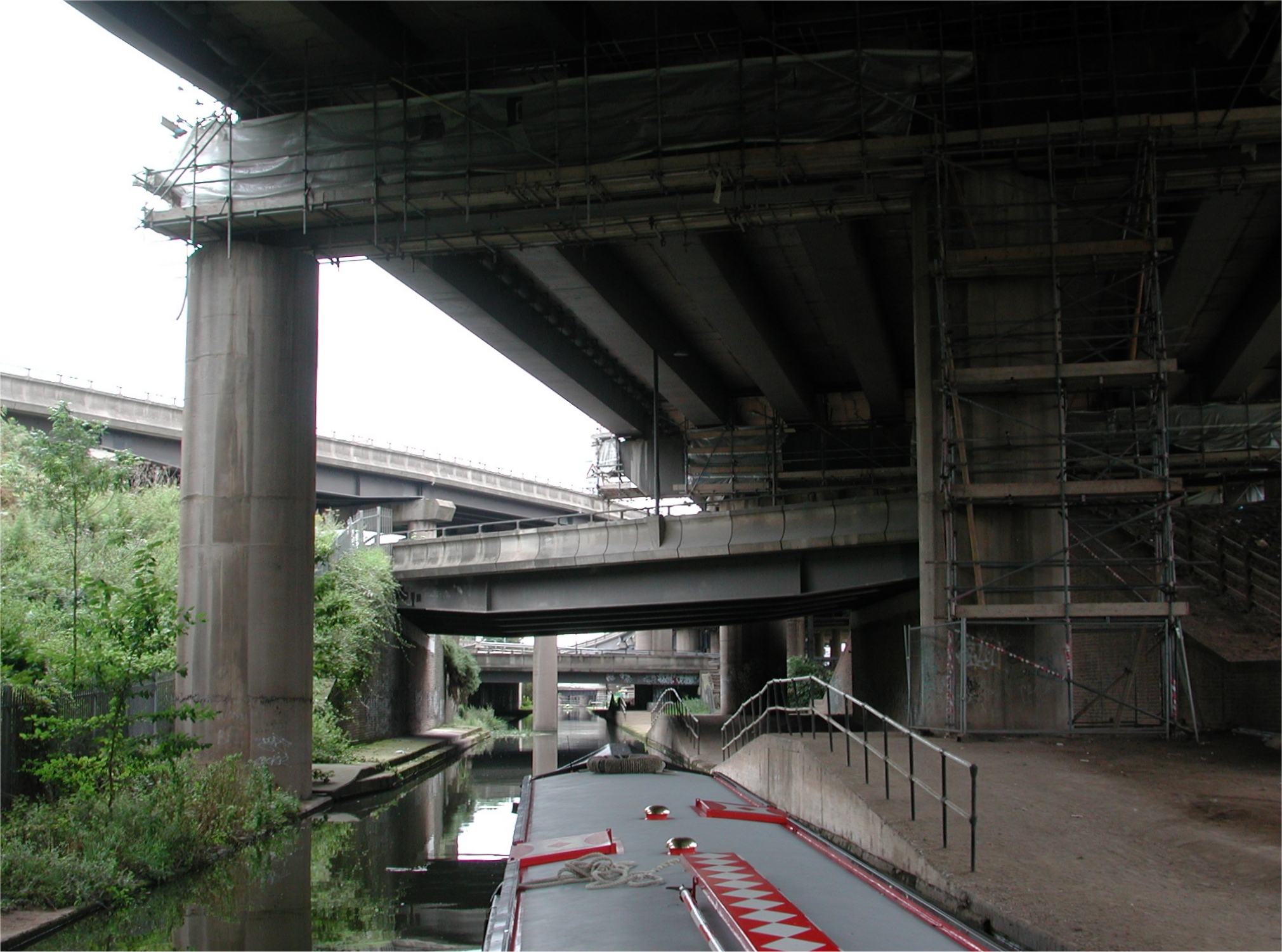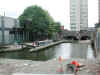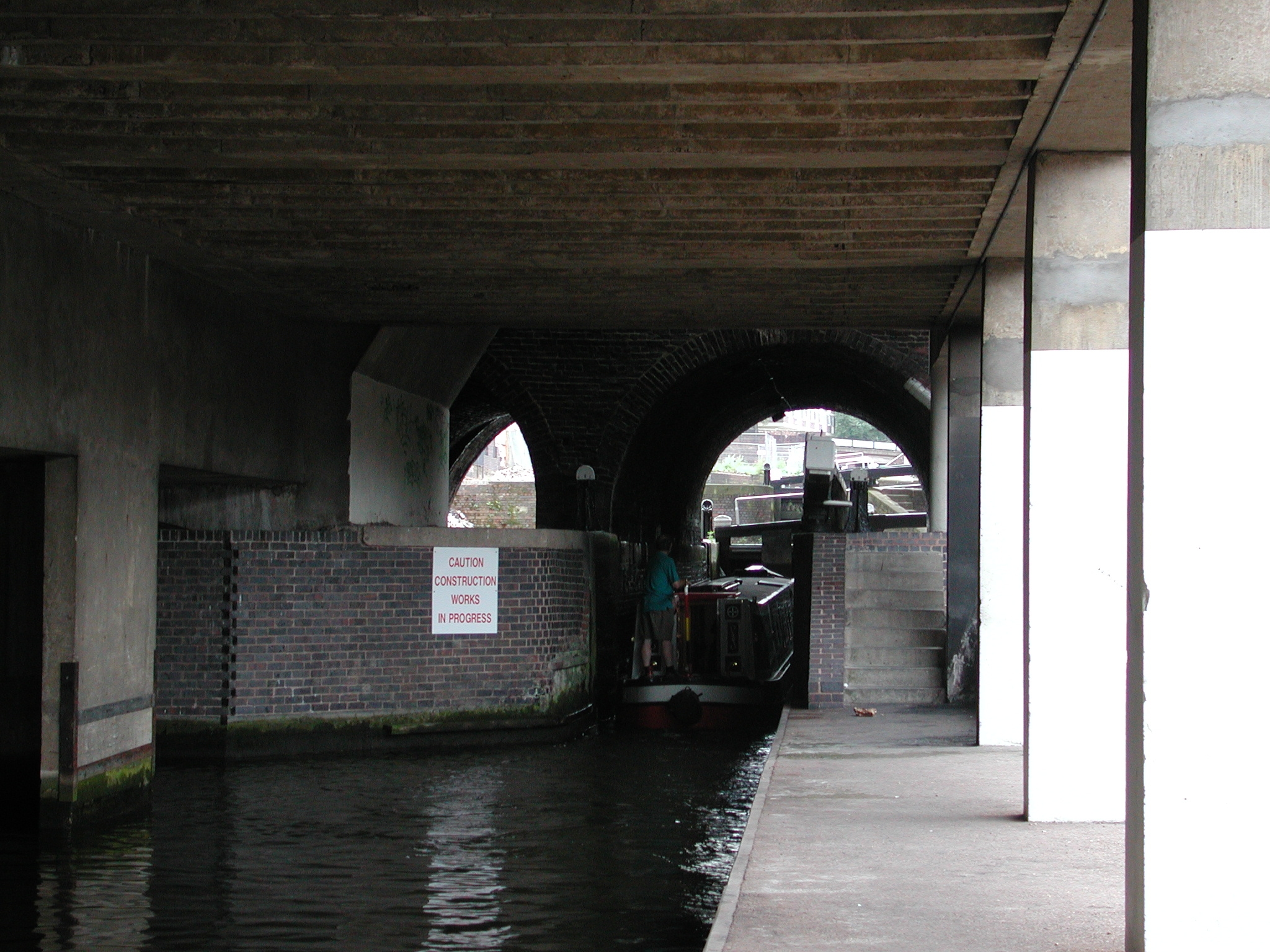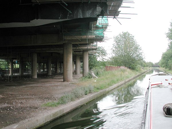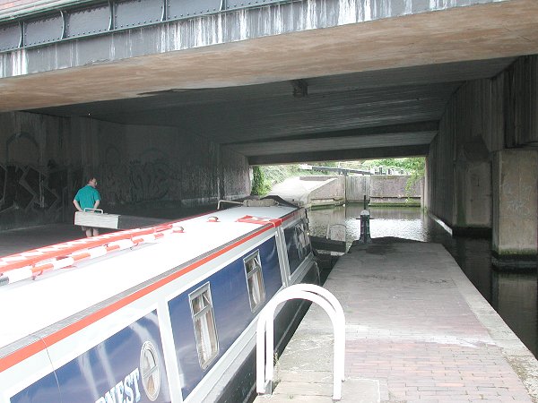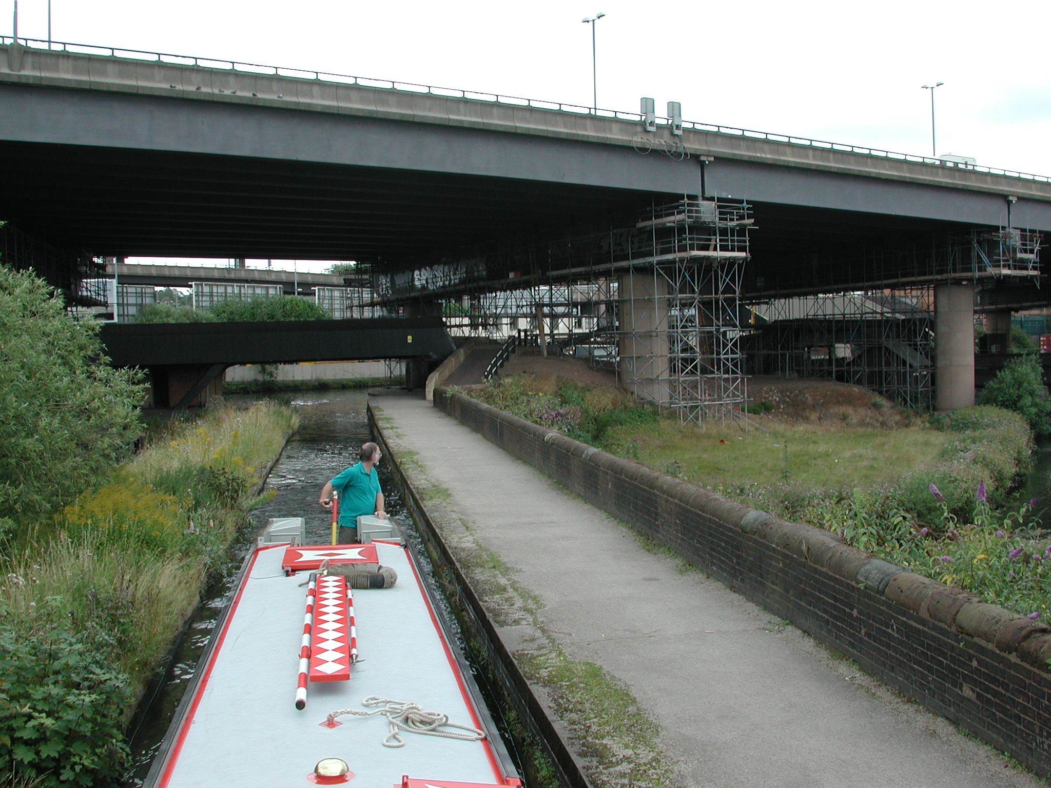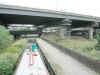 Out of the bottom at 11:40, we were amazed to find that the long pound between locks 11 and 12 had been dredged. Arrival at Salford Junction, after picking our way under the many motorway bridges was at 11:55 and we turned the