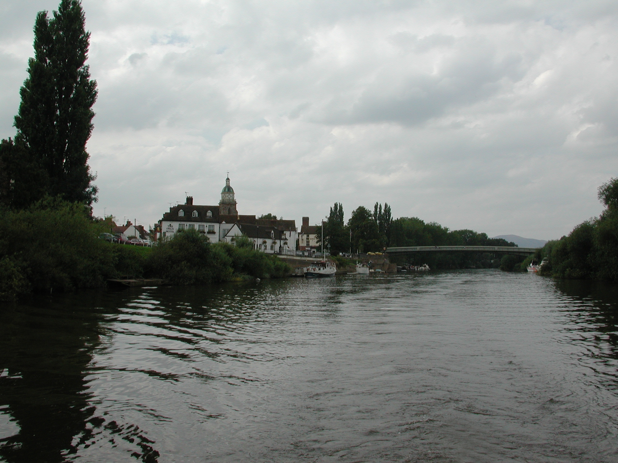 Looking back at Upton Upon Severn. Moorings to the left of Upton Bridge. River