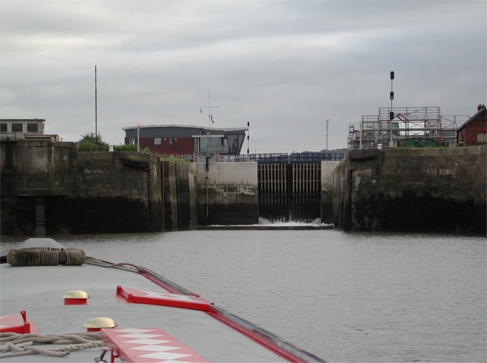 Portishead Marina entrance lock. Note the floating pontoons. Earnest's periscope
