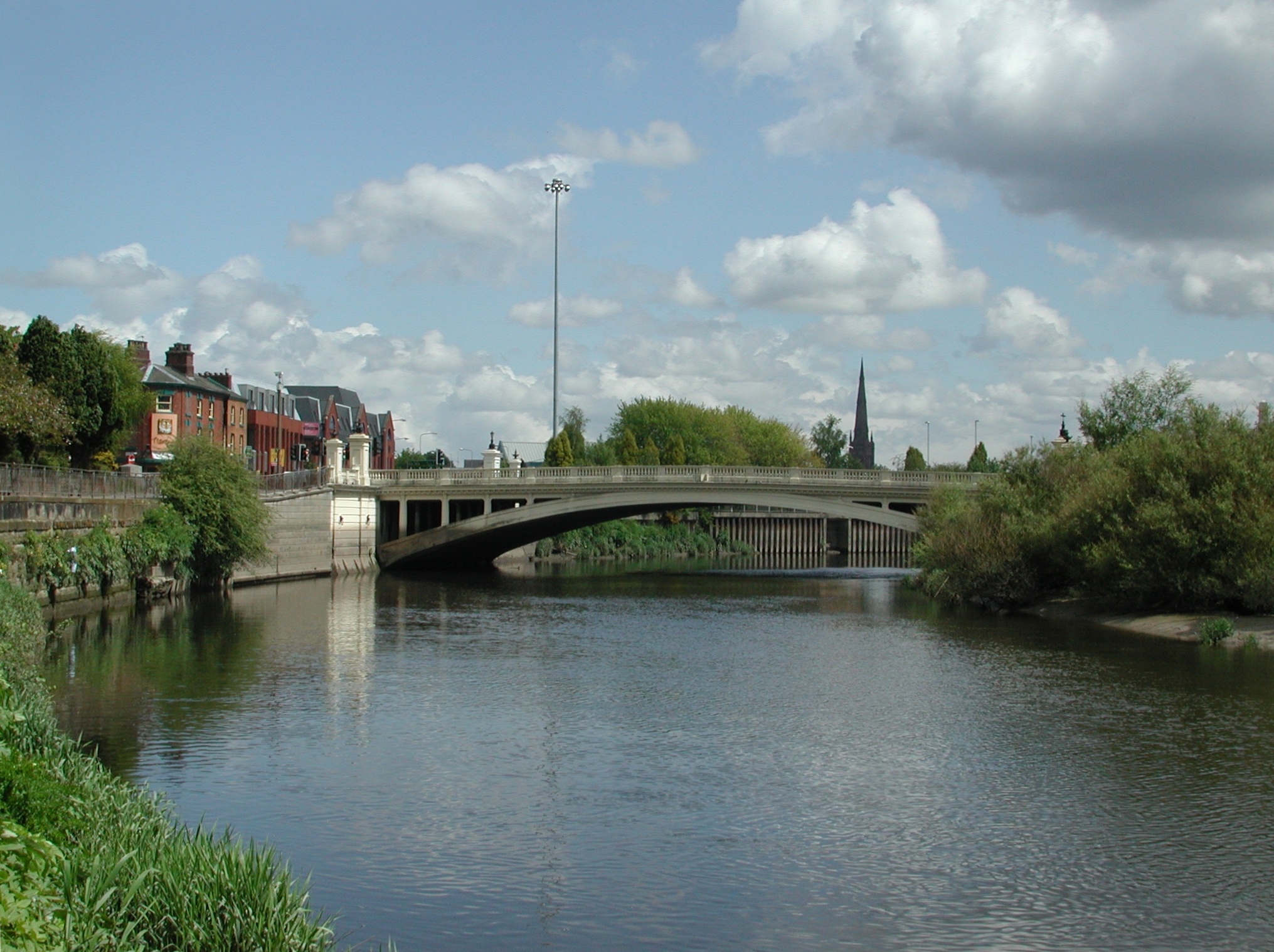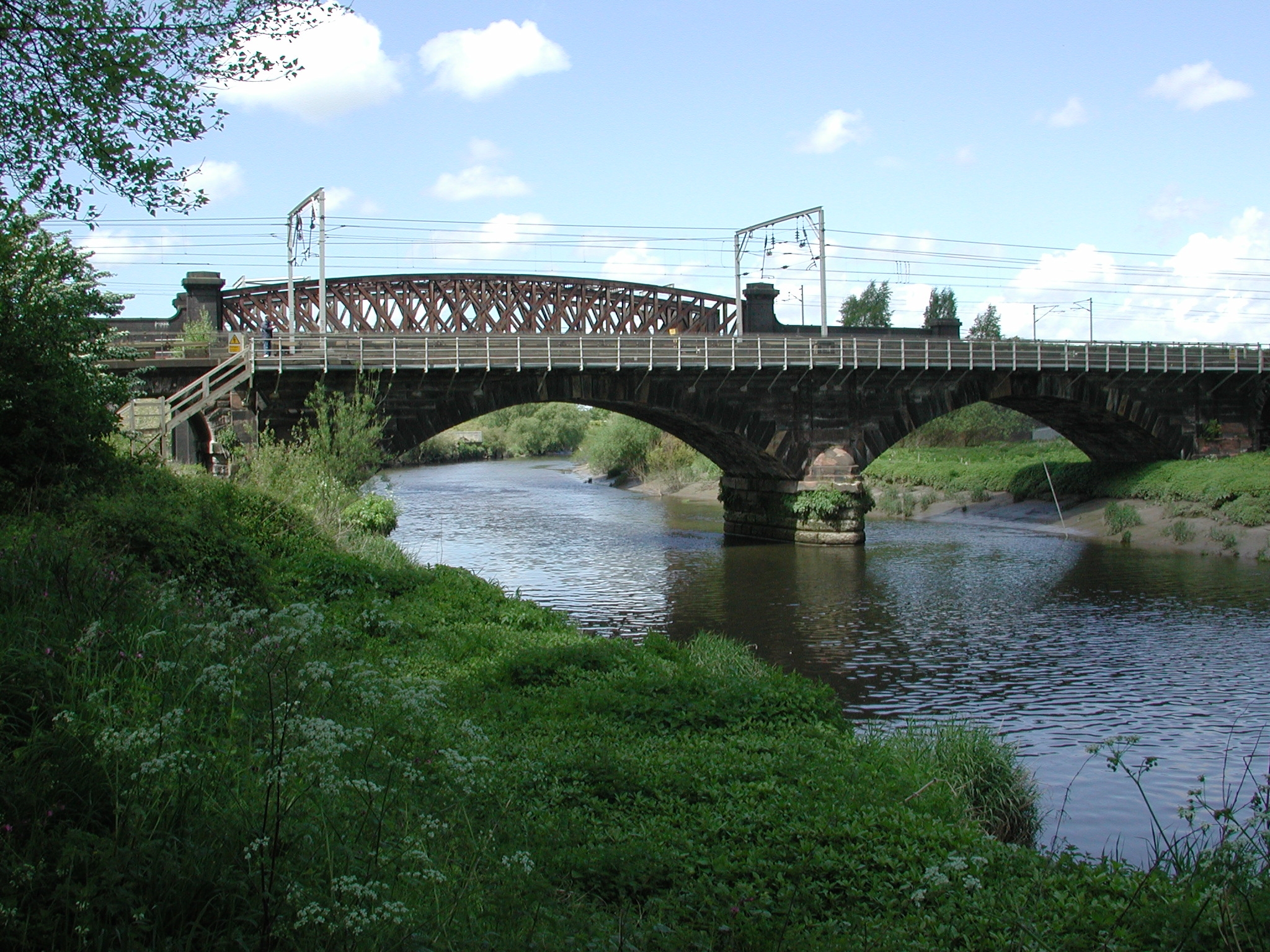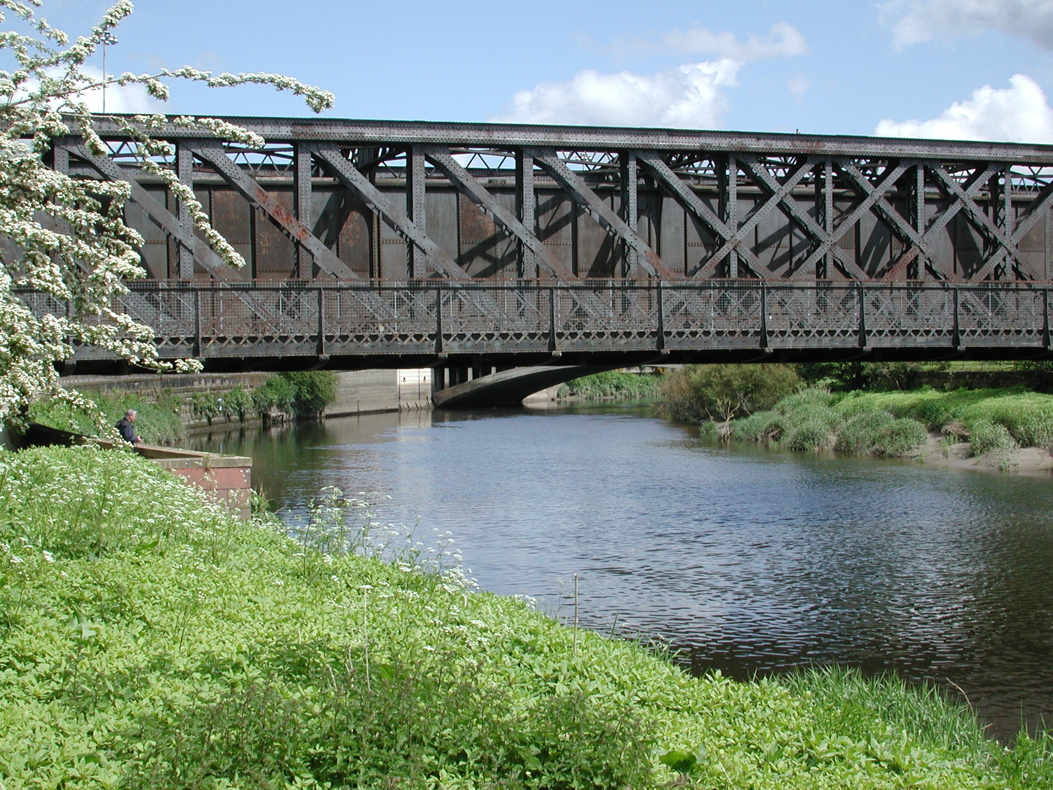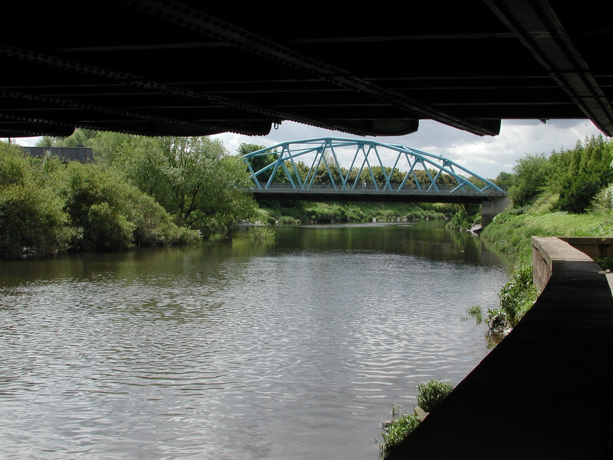 Here is a view looking up at the first bridges across the tidal Mersey in
