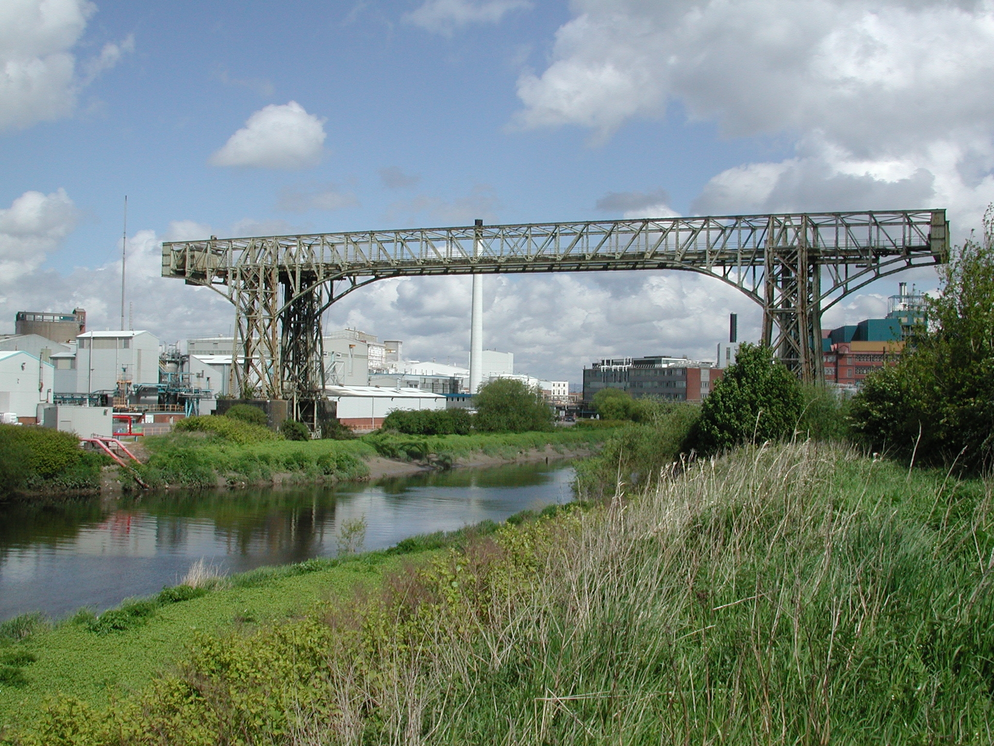 A difficult to get shot looking upstream of the listed Warrington Transporter