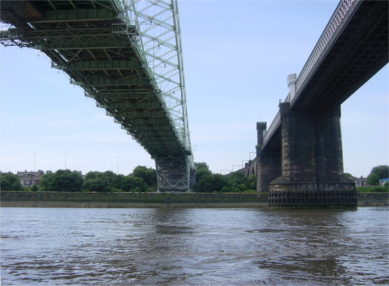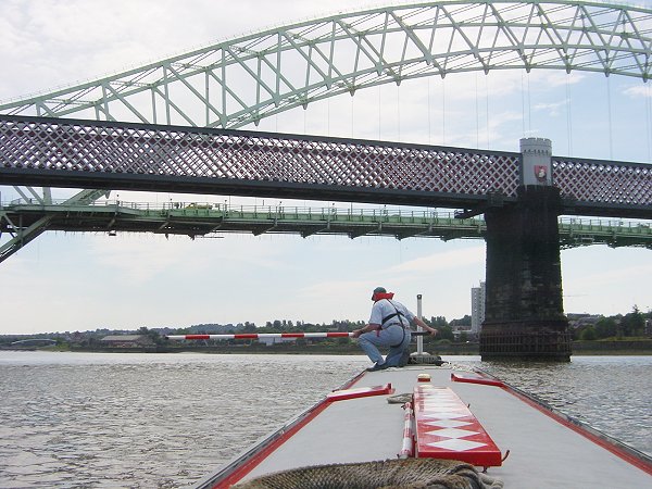 Runcorn Bridges. Going through on tickover with the flood. Mersey Estuary.