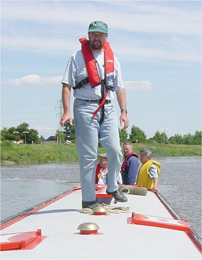Runcorn Bridges. Neil now on depth sounding with barge pole - we seem to have