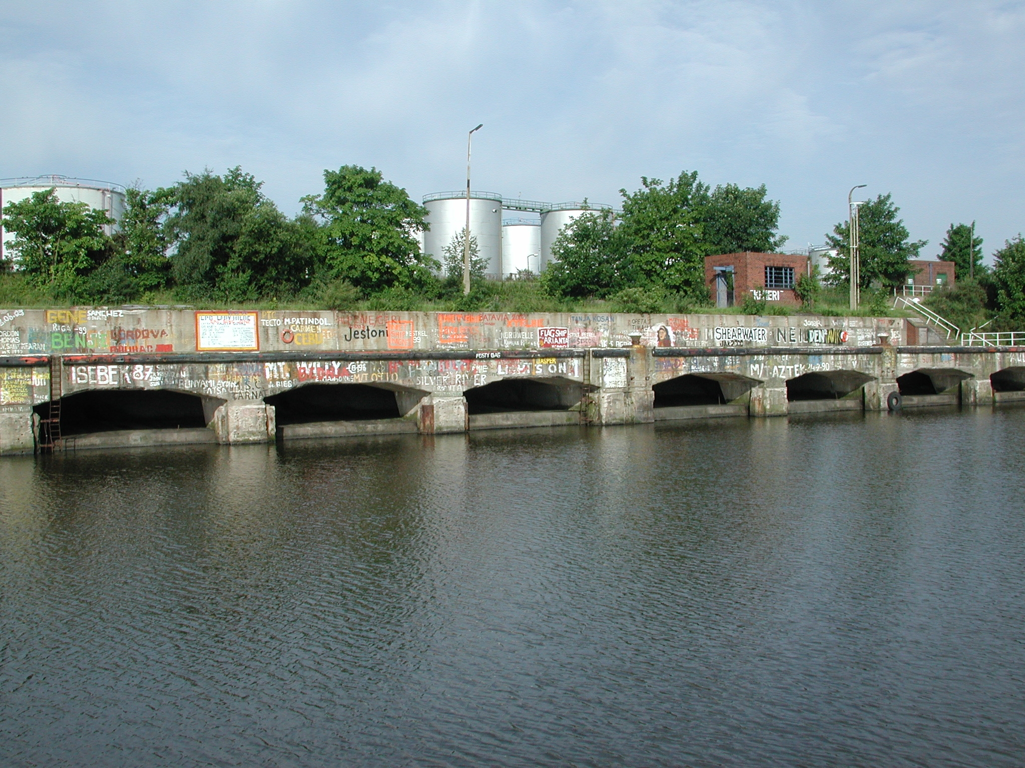 Rather a lot of boat graffiti on Sheer Legs Oil Berth. Eastham. Manchester Ship
