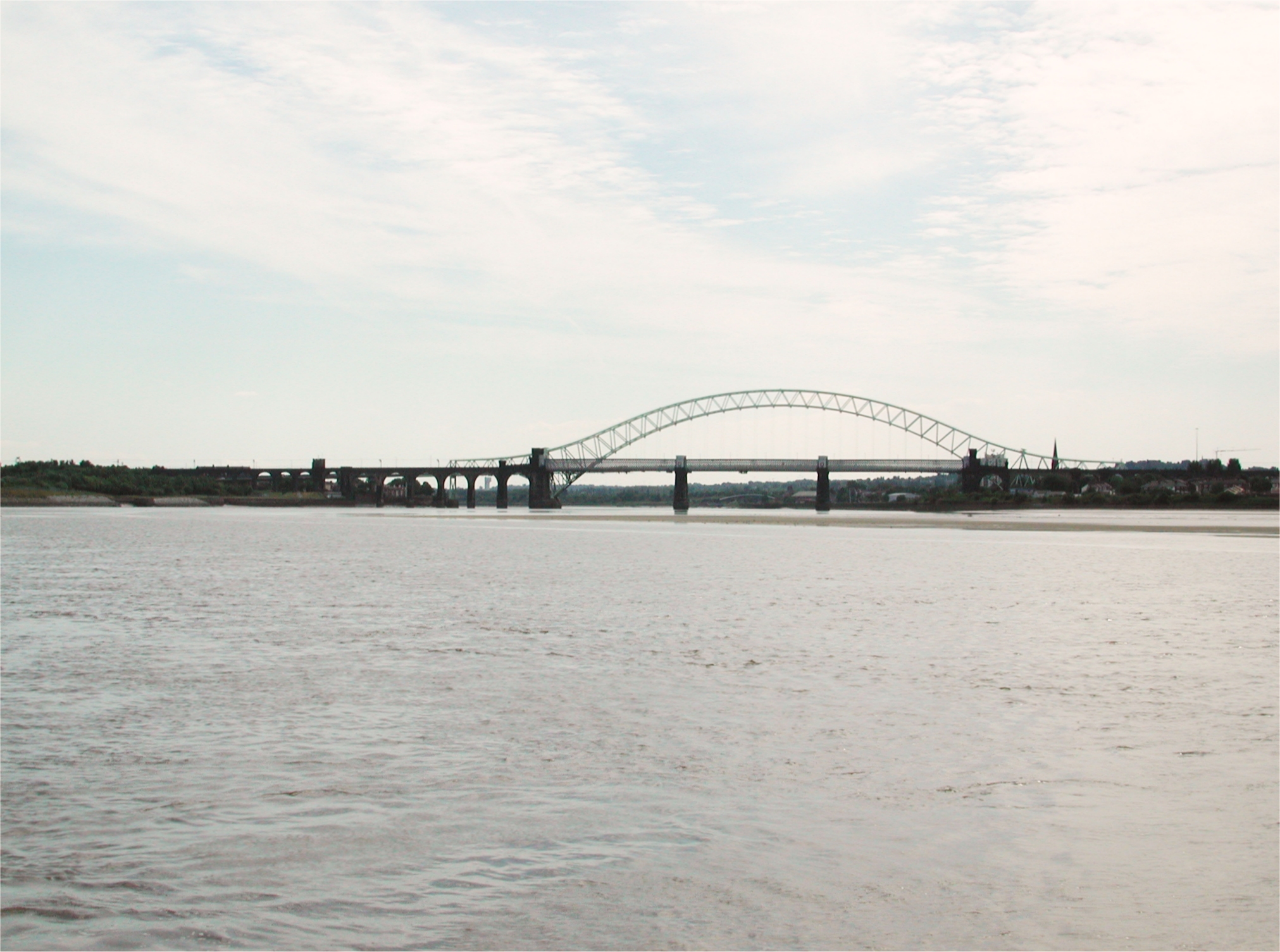 Looking back at the Runcorn Bridges. Tidal River Mersey.