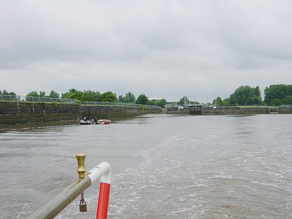 Leaving Spike Island Lock. The inflatable belongs to Mersey River Rescue, which