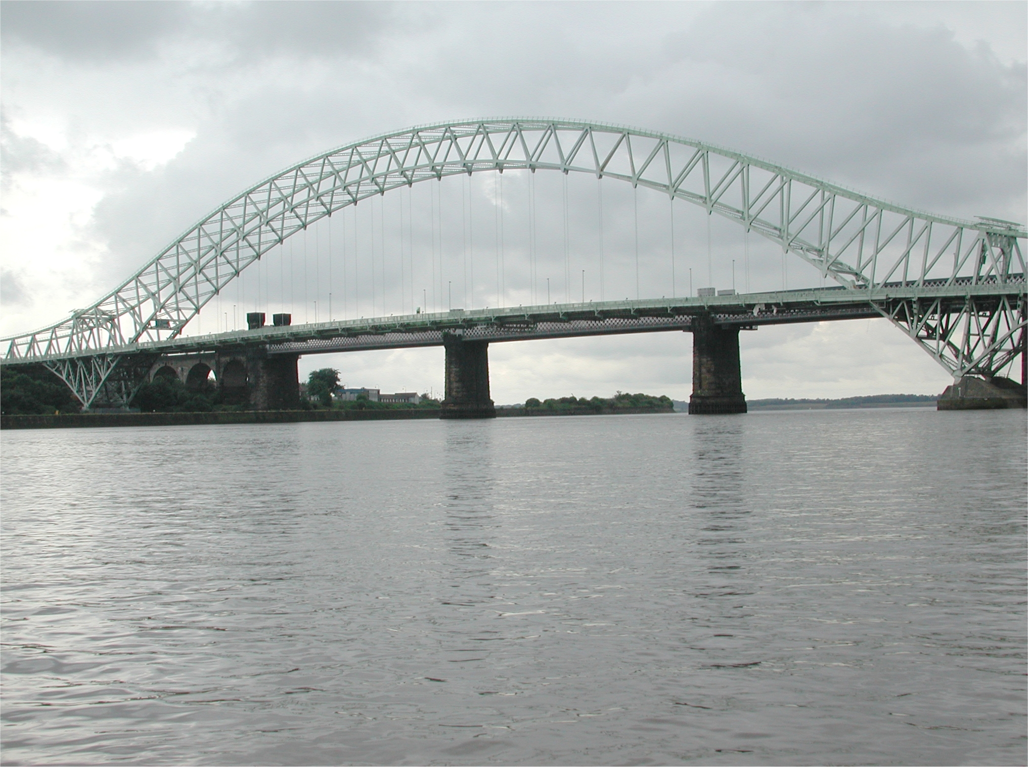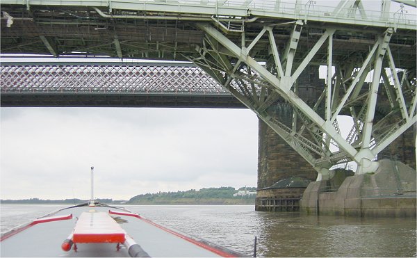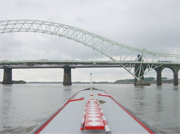 Creeping through the Runcorn Bridges. Tidal River Mersey.