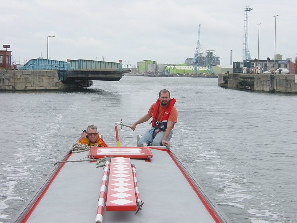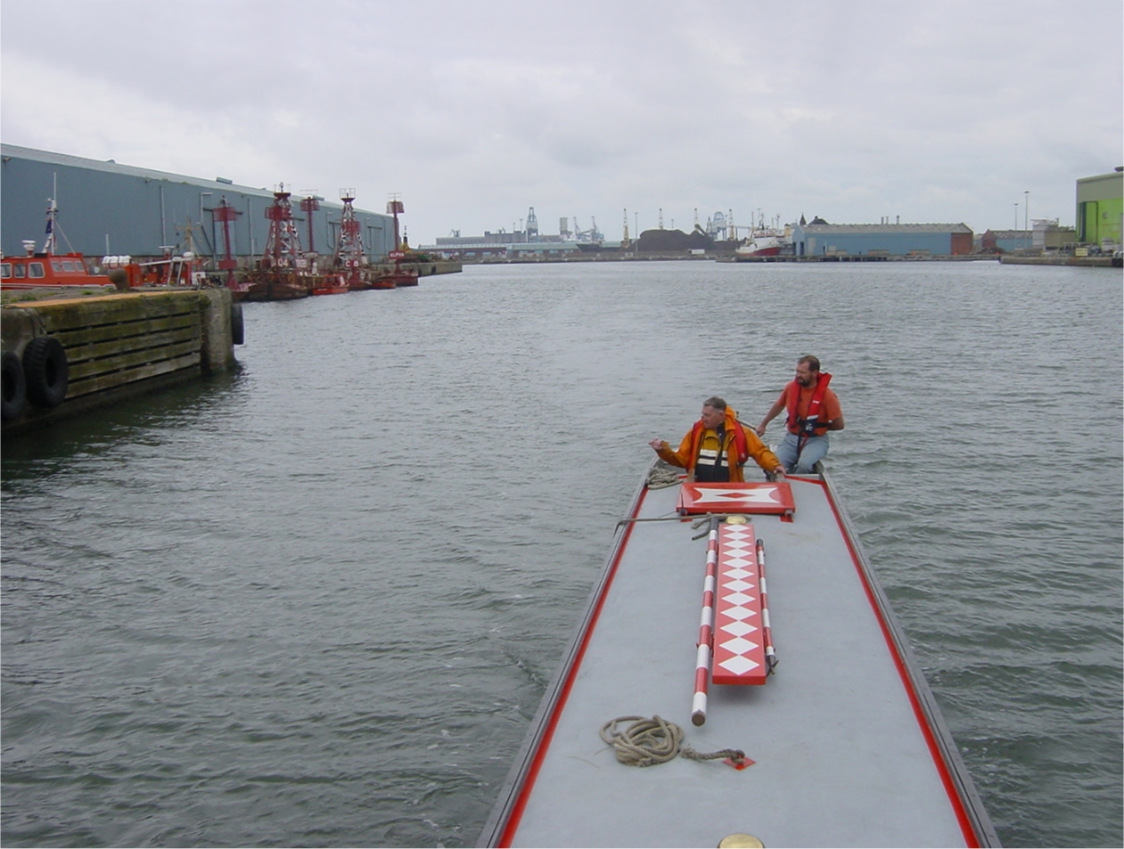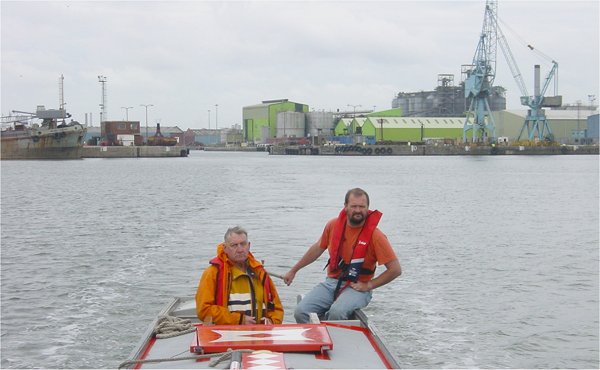 on dry land! Peter Wright and Martin Clark look on. Liverpool Docks.