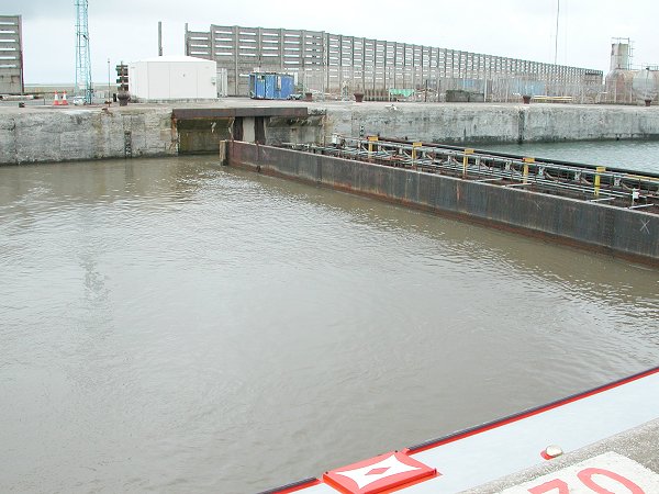 Safely in Langton Lock, Liverpool Docks. The outer gate slides into position.