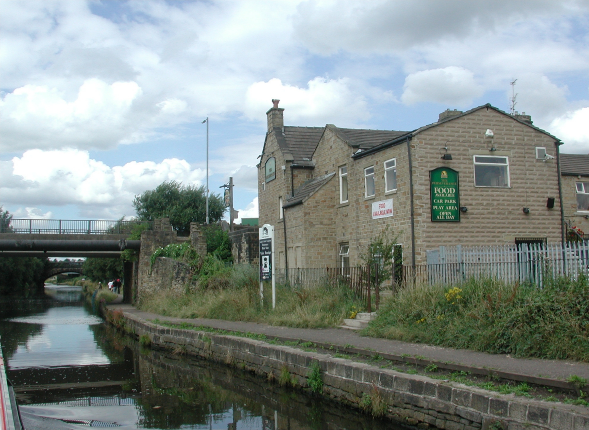The Perseverance pub at Thornhill Lees. Forge Lane Bridge ahead. Calder and Hebble