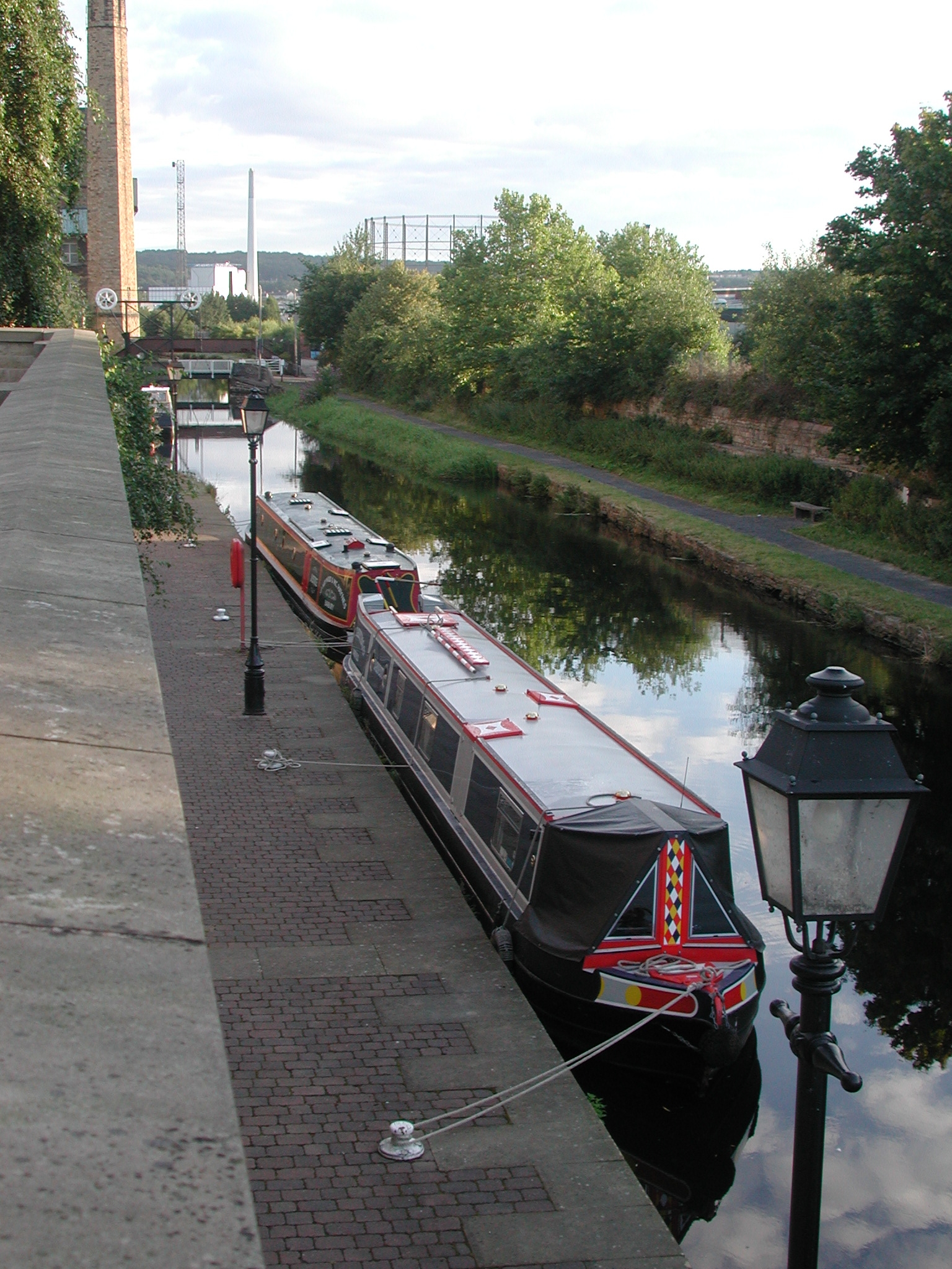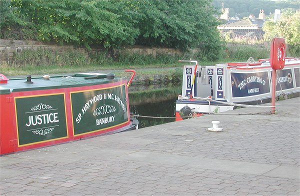 NB Justice and NB Earnest at Sainsbury's visitor moorings in Huddersfield.