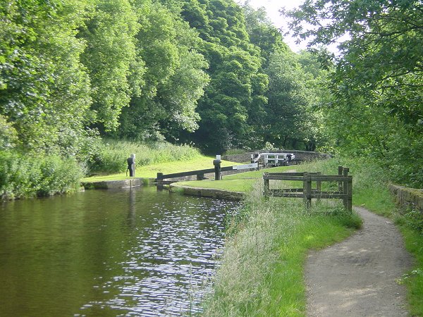 Cellars Lock No 34 E, Moorvale Lock No 35 E beyond. Huddersfield Narrow Canal.