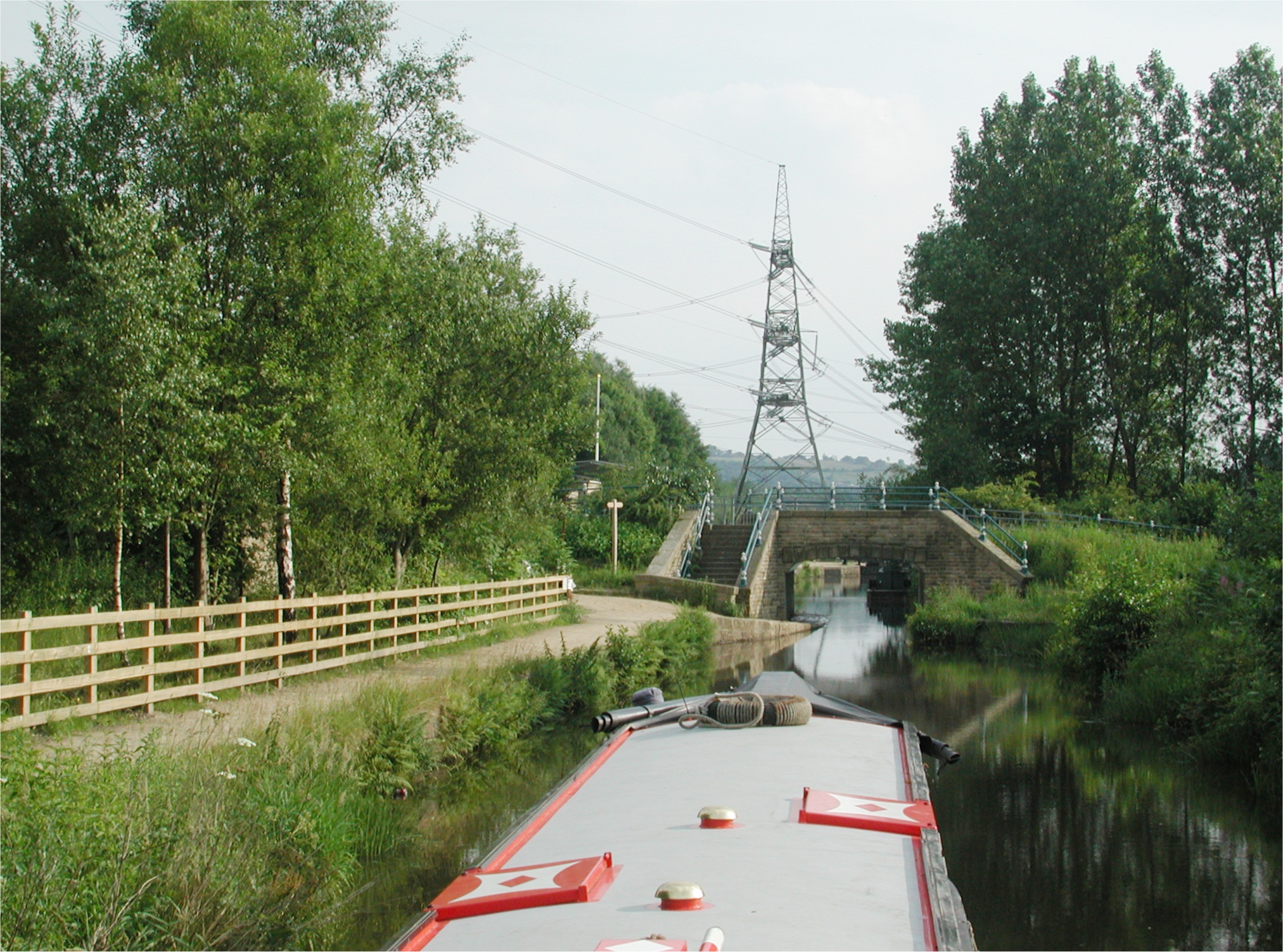 Bywith Lock No 8 W. The straddling pylon beyond. Huddersfield Narrow Canal.