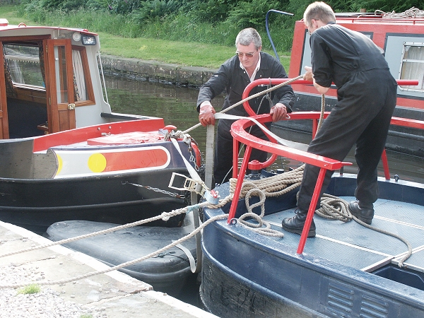 First boat in tow is strapped on. Marsden. Huddersfield Narrow Canal.
