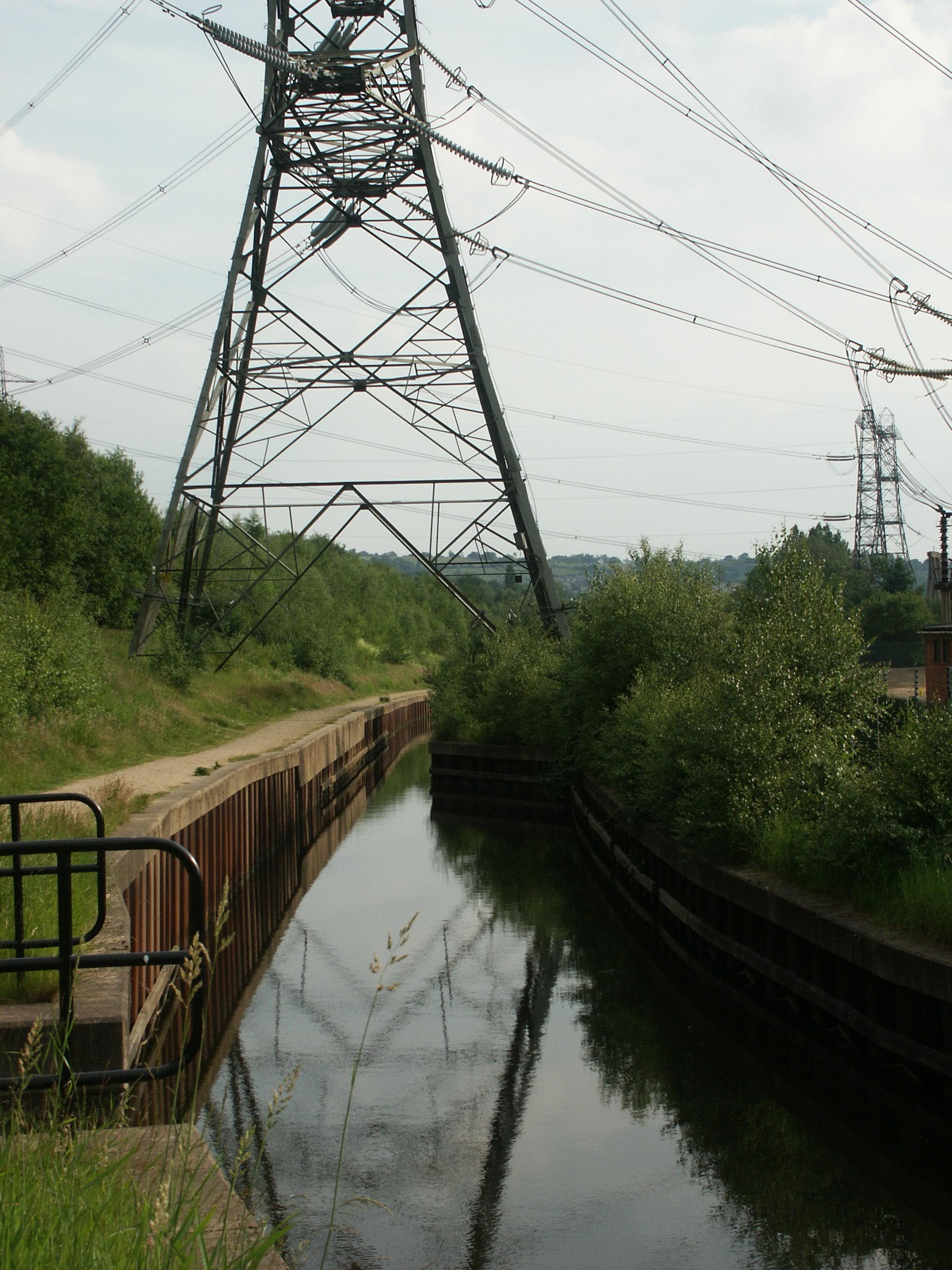 The straddling pylon beyond Bywith Lock No 8 W. Huddersfield Narrow Canal.