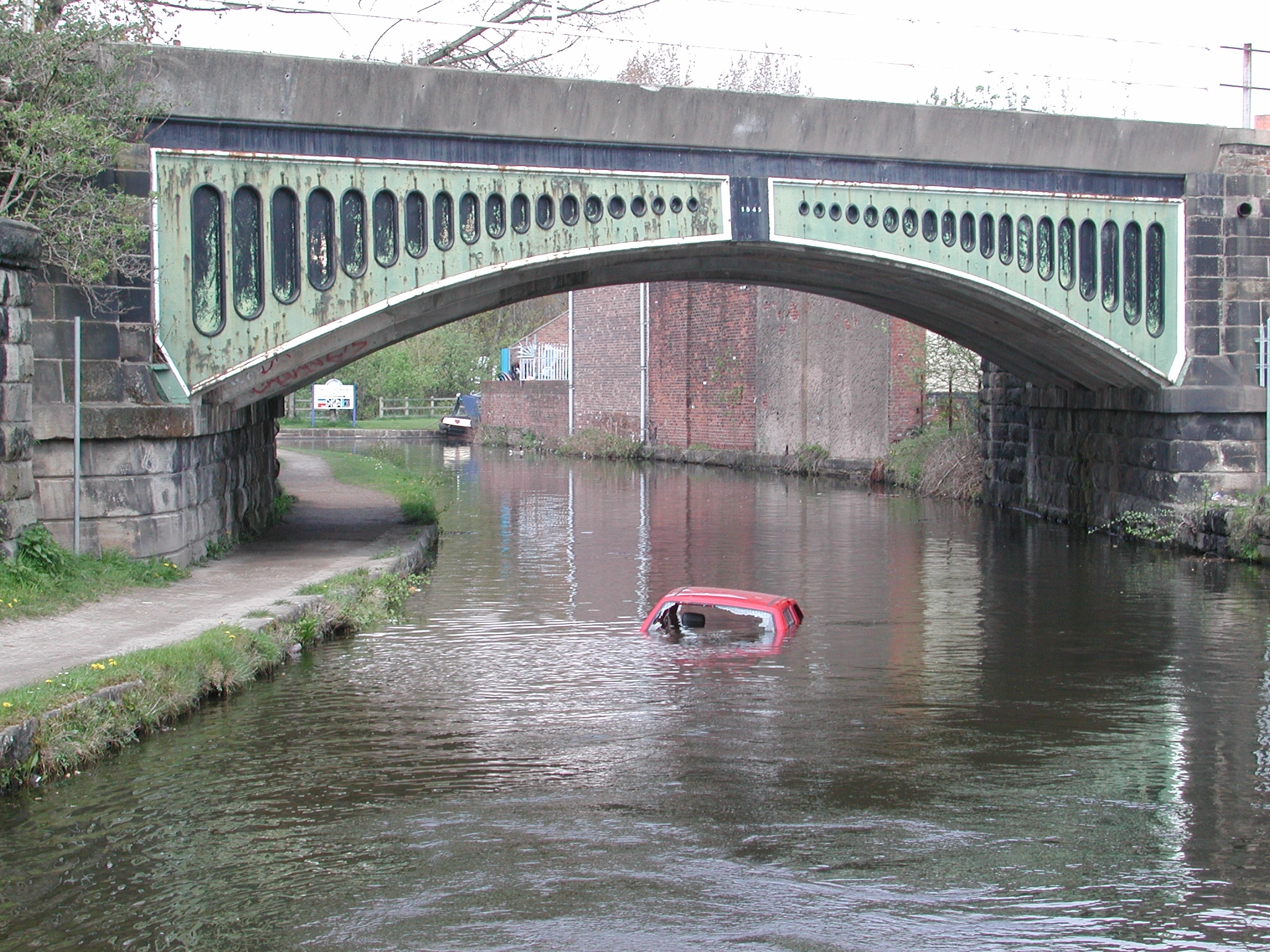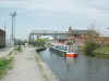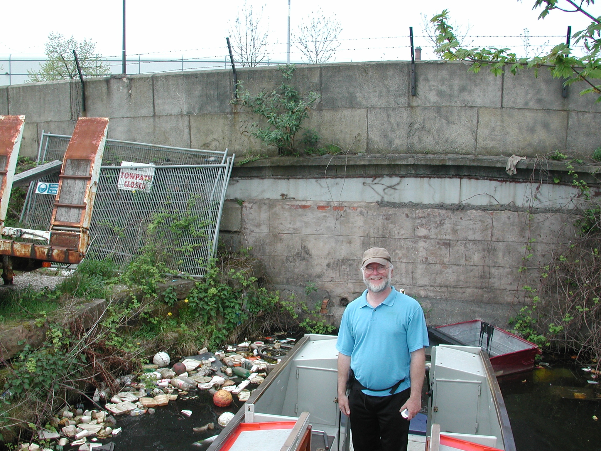 Dukinfield Junction was passed at 13:25 and we started back up the shallow Lower Peak Forest canal. A red Fiesta was lurking in the cut just beyond the first railway bridge an unprotected alley leading straight down to the offside of the canal at this point. Around Bridge 12 we had trouble in pulling up and getting over to let the community boat pass, then we had to reverse back to let Ed Mortimer's little day hire boat "Astra" through an old swing bridge hole. After this the canal looked a total brown sticky mess, with bits of cloth and plastic floating about all over the place.