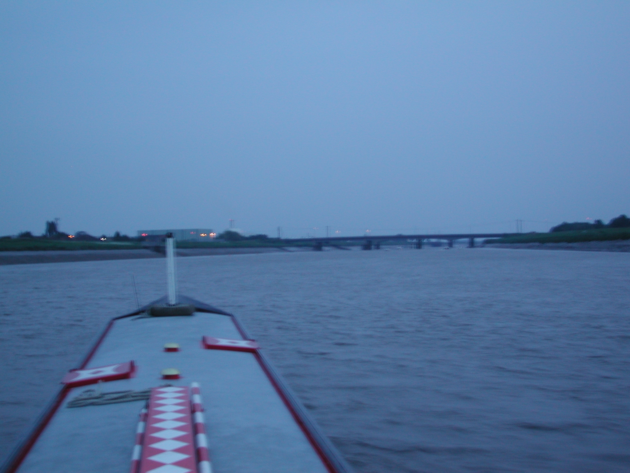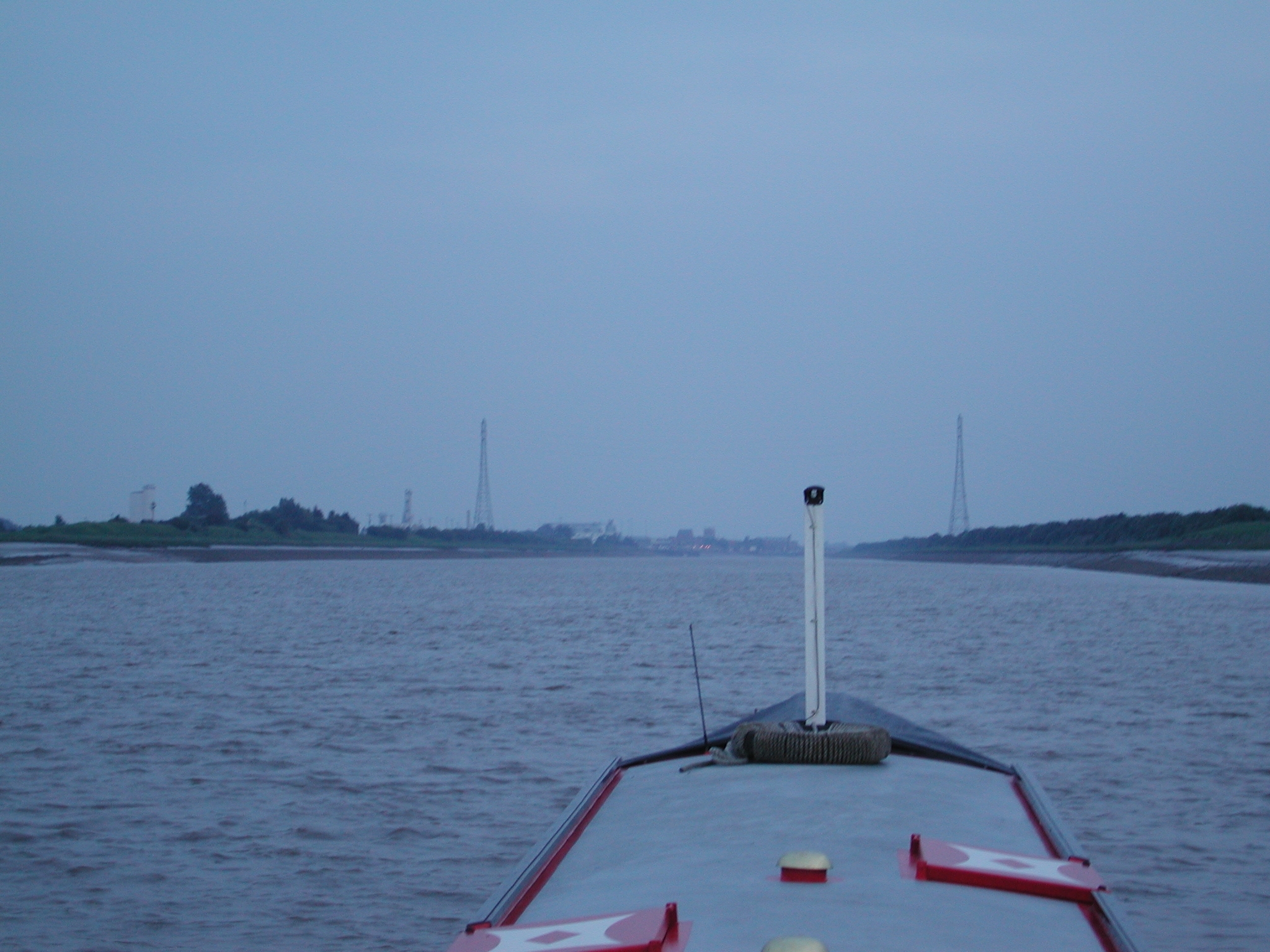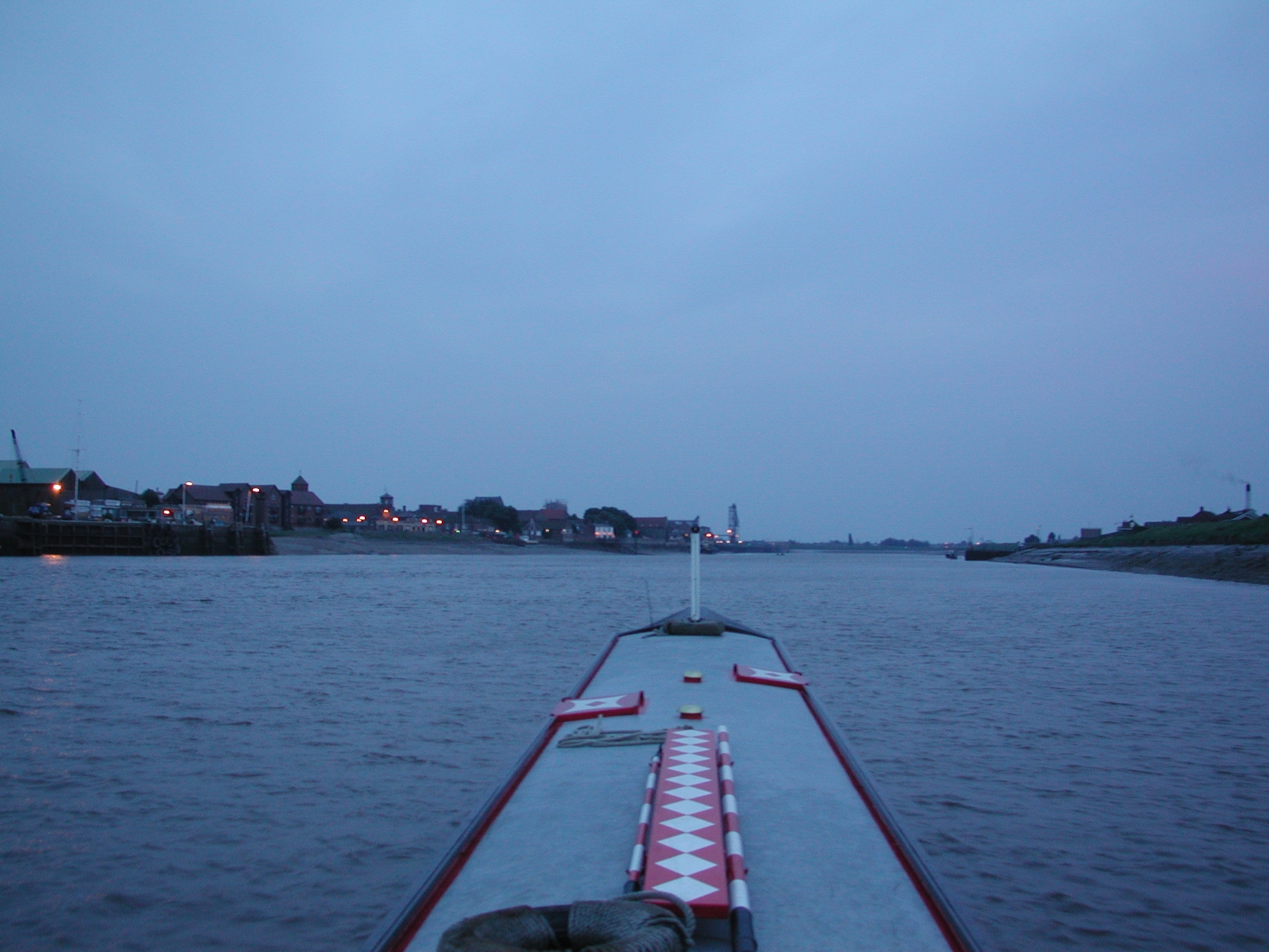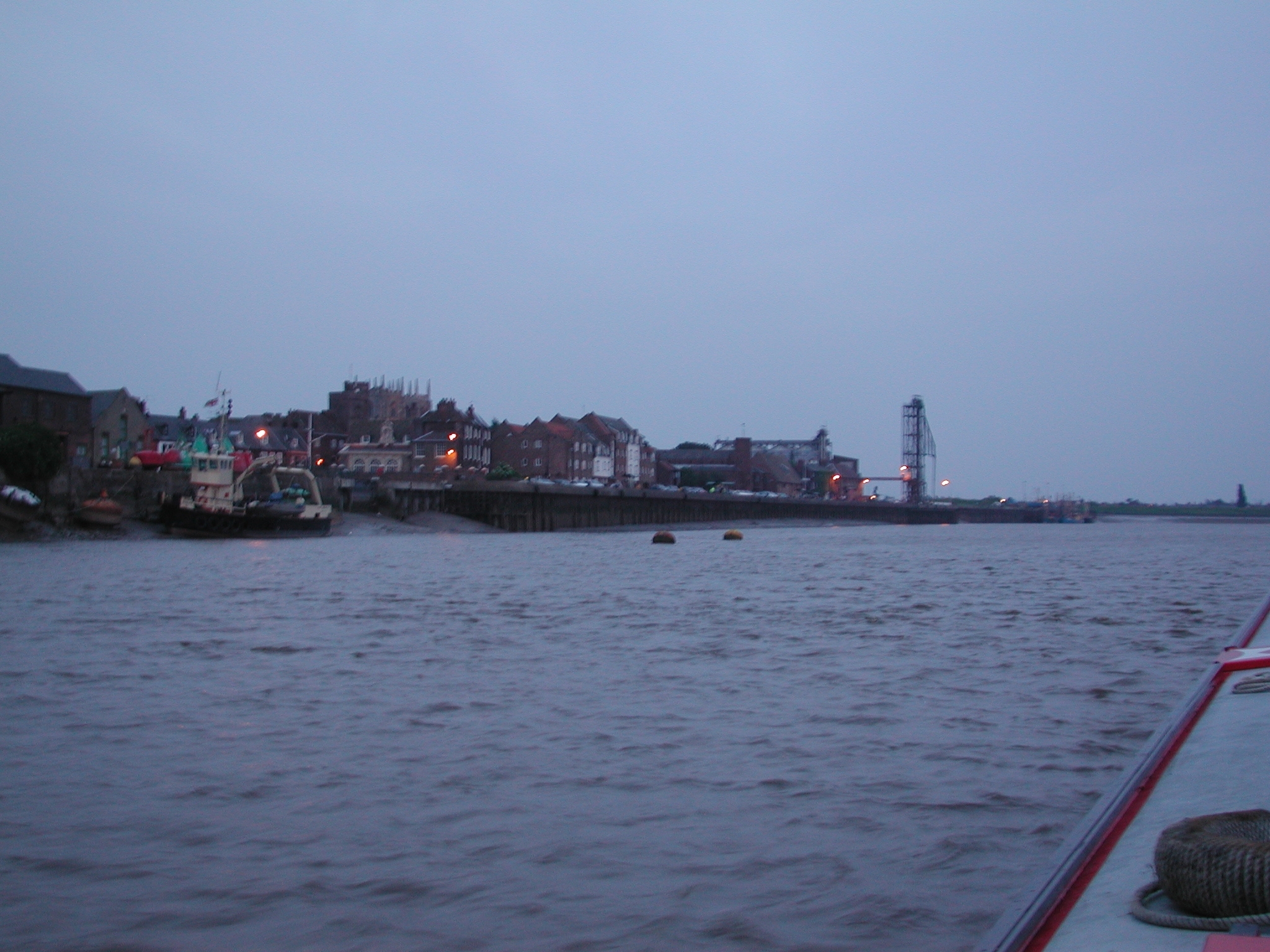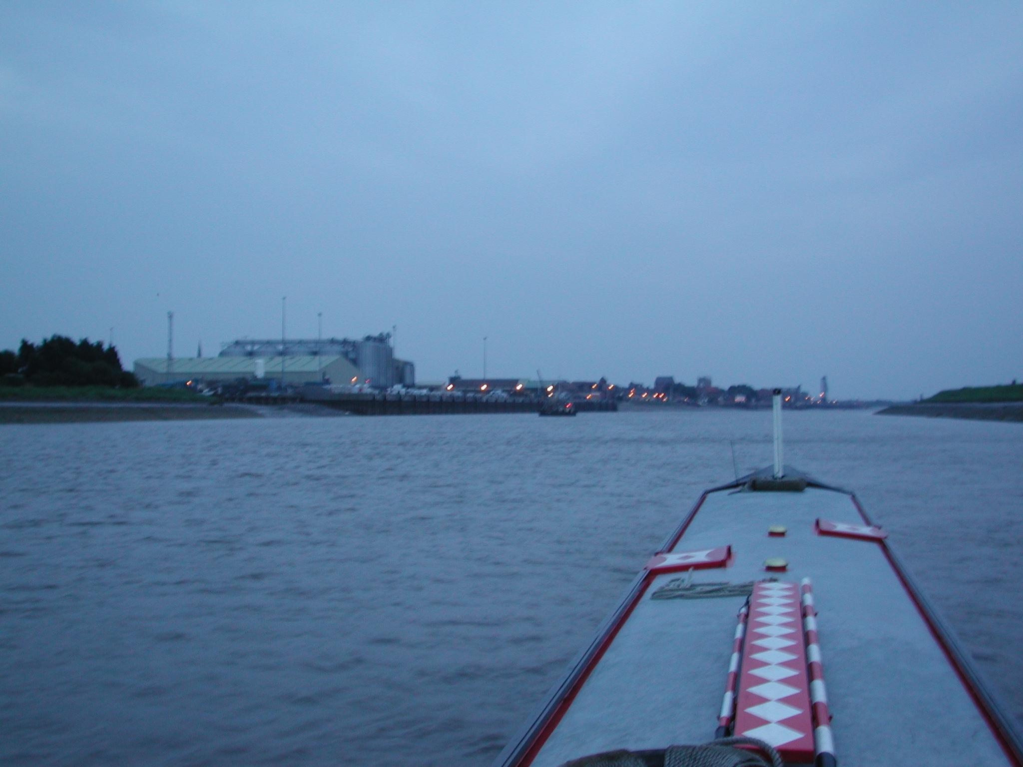 Lynn Cut. Kings Lynn comes into murky view in the fading light.