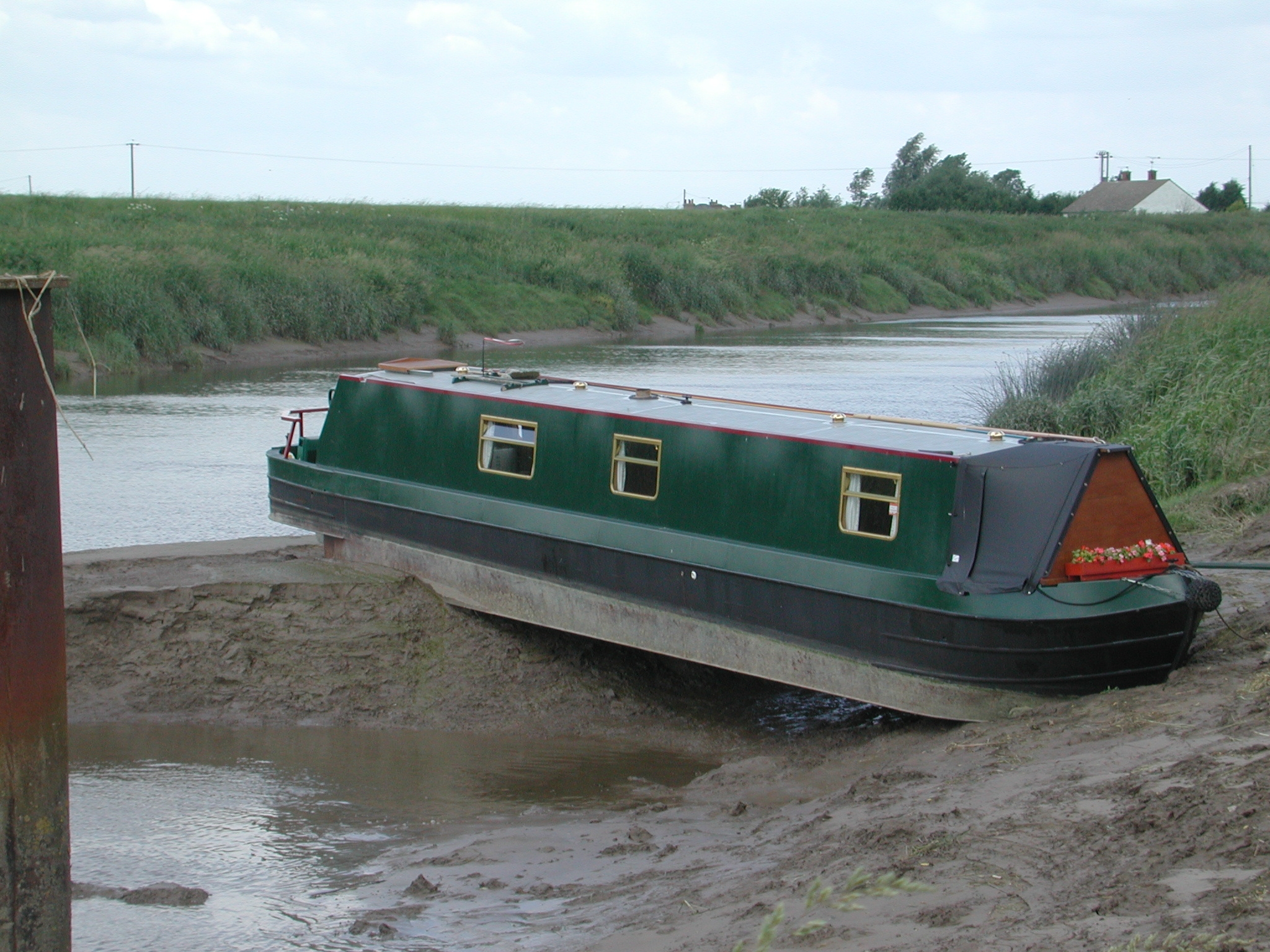 The beached narrowboat at Denver. Tidal River Great Ouse.