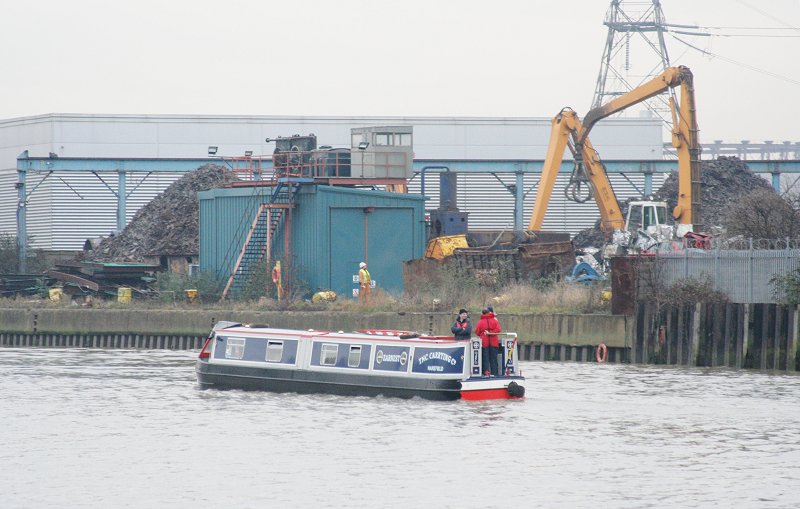 King George V Dock. The crew of NB Earnest have lunch on the move. (Photo Tim Lewis)