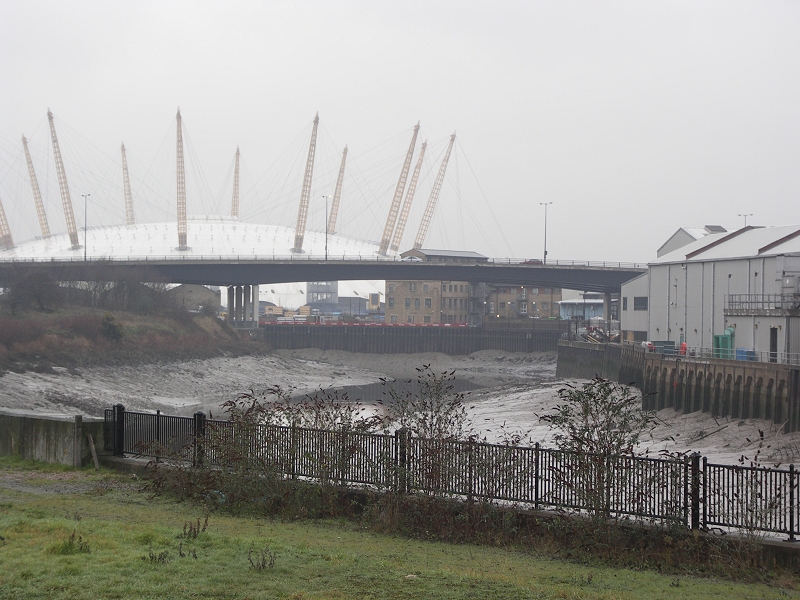 Bow Creek, dried out at low water. Picture taken from Canning Town Station.