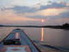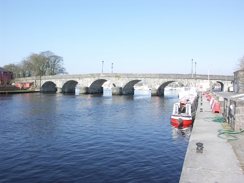 The Shannon still had a fair flow, still subsiding from the recent floods, so we made good progress in the evening sun. Just past the spindly 1930's concrete Hartley Bridge, the Boyle River comes in from the right, this is navigable up to Lough Key. Finally Carrick came into view and after curving round the large hire boat bases we lined up for Carrick Bridge. We spotted a potential mooring above the bridge, but as there was a fair flow, we decided to go through the bridge, wind and then take stock of the mooring situation. We were in luck and managed to find a suitable length mooring on the old wharf, just below the bridge, mooring up at 20:00. We presume that the lack of hire boats was explained by this being the main changeover day.