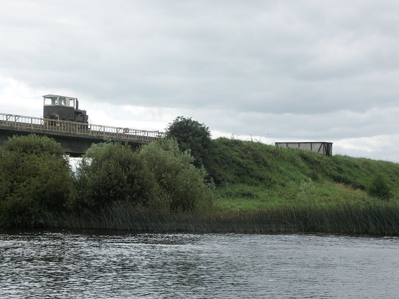 Pluckerstown Bridge was the next to be encountered (08:55). This was a fairly modern flat concrete affair, with low headroom, we measured it at 6ft 7ins, with the feeder having a fair flow. This presented no problem to Earnest, even with the cratch board up. After Pluckerstown Bridge the towpath is on the east bank, forming a minor road to a couple of properties, for about three quarters of a mile. Beyond here the feeder heads south, away from the Hill Of Allen and the countryside opens out, with the feeder on a low embankment. At this point the canal widens for a few